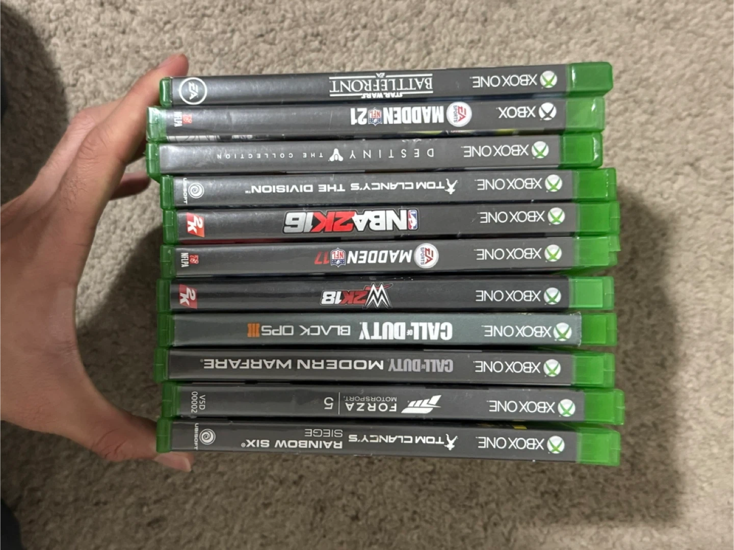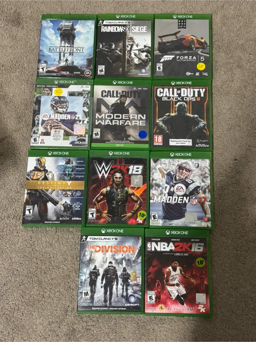 68Selling a bundle of Xbox One games. Includes titles like: - Star Wars Battlefront - Tom Clancy's Rainbow Six Siege - Forza Motorsport 5 - Madden NFL 21 - Call of Duty Modern Warfare - Call of Duty Black Ops III - Destiny The Collection - WWE 2K18 - Madden NFL 17 - Tom Clancy's The Division - NBA 2K16 11 x box one games some are $ 5 or more than 5 message for individual prices they are in good condition or take all for $ 60. Thanks