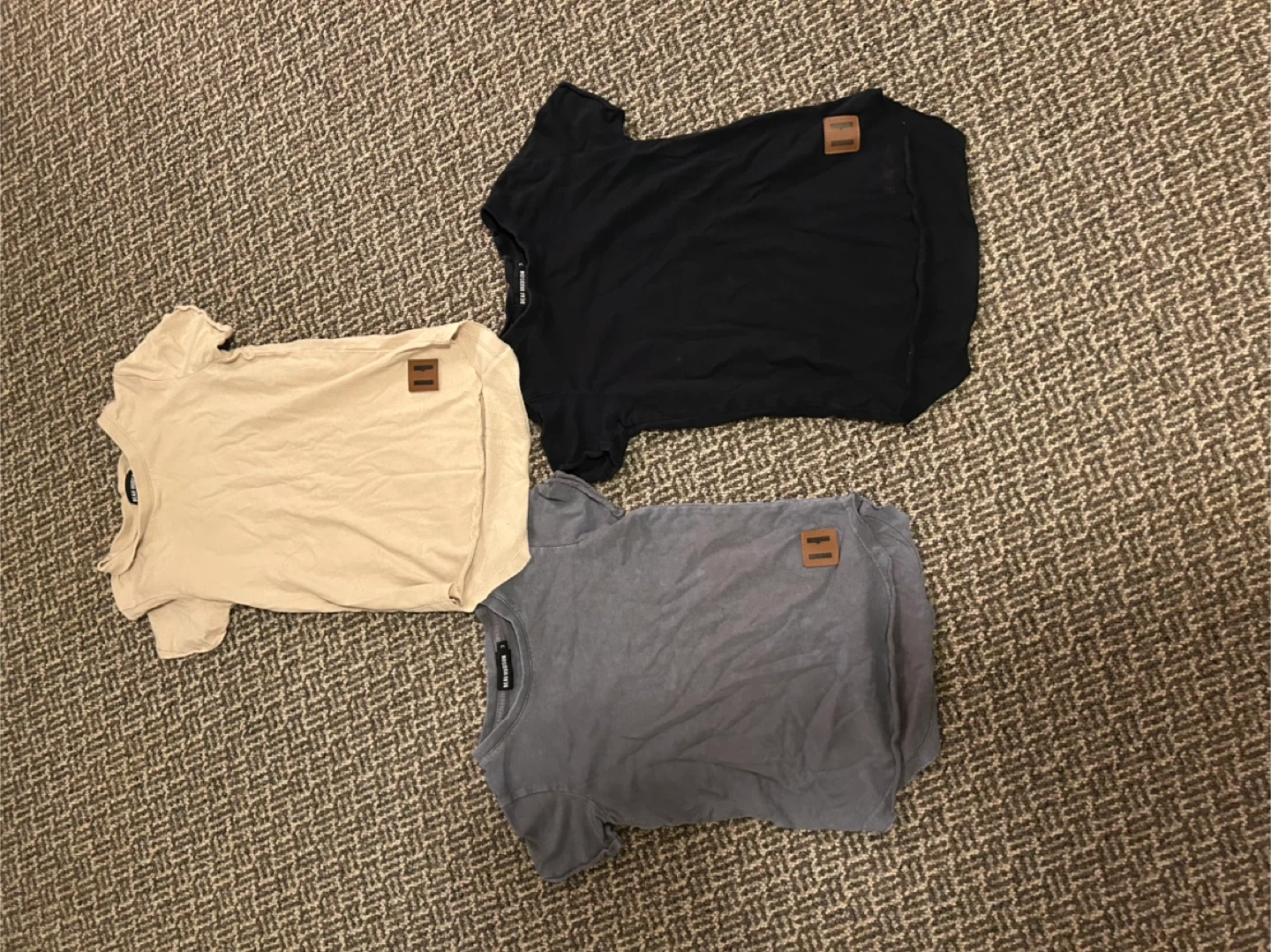 Selling a set of Beau Hudson kids' t-shirts. Includes one black, one beige, and one grey shirt. Great for everyday wear!