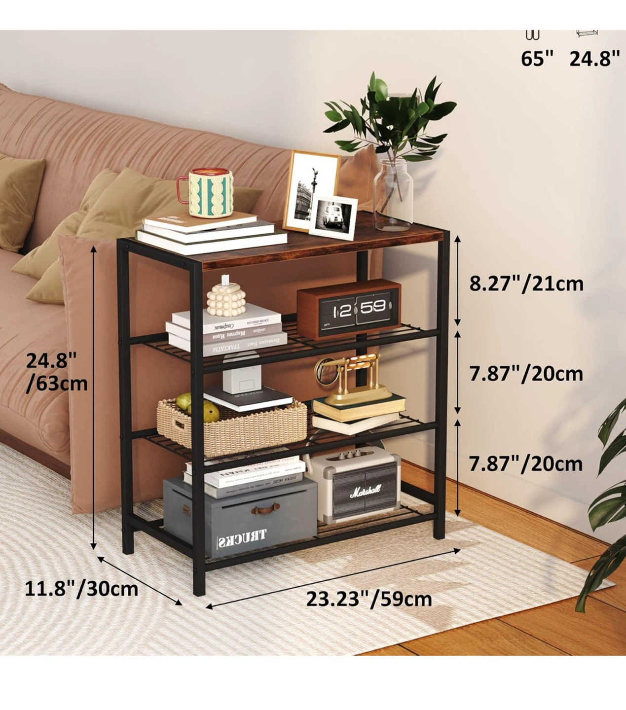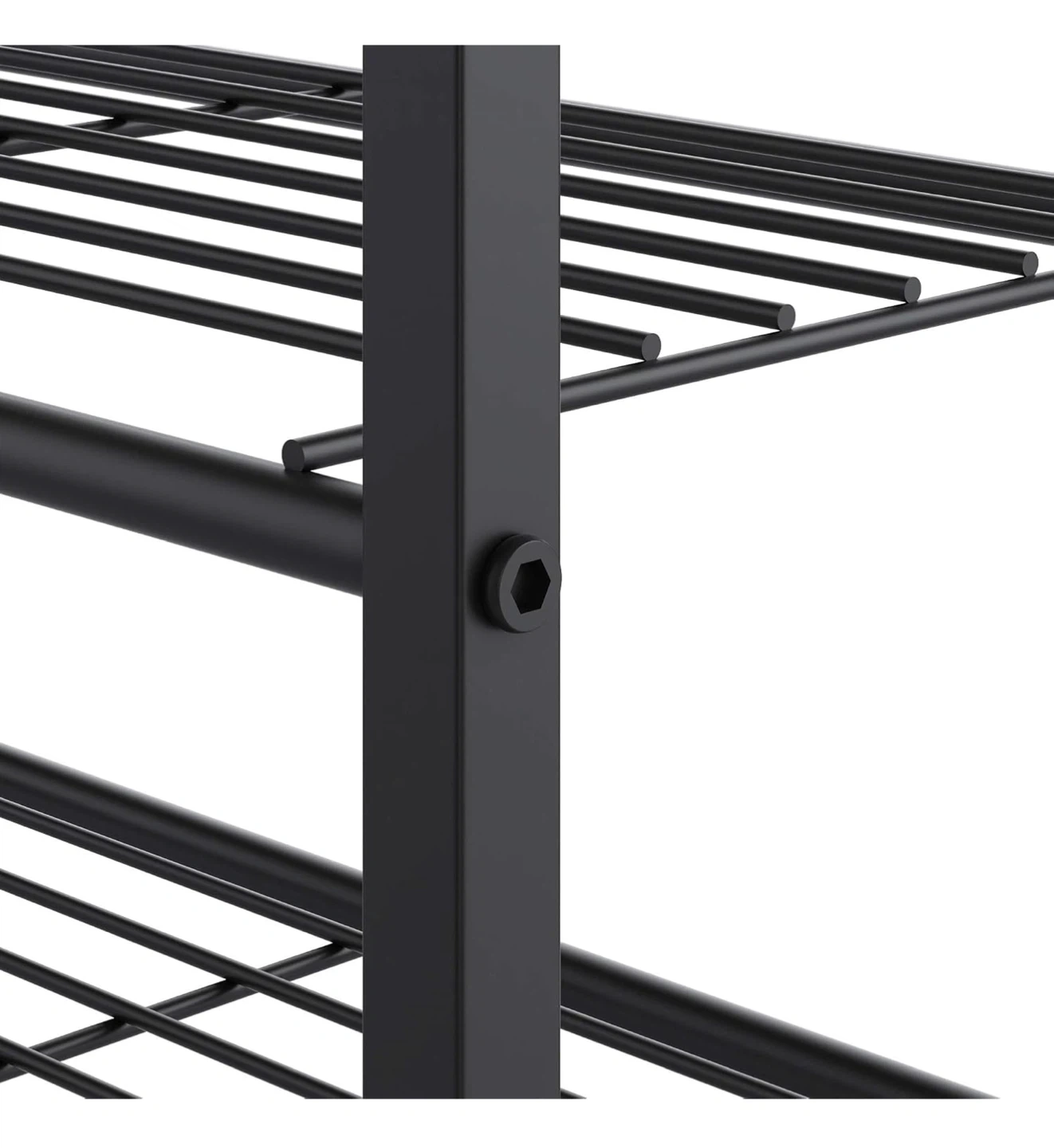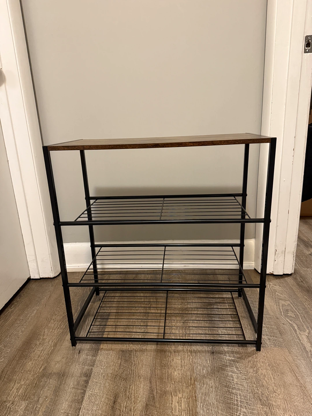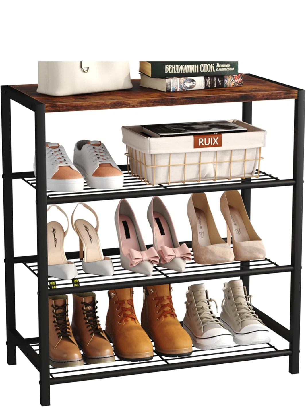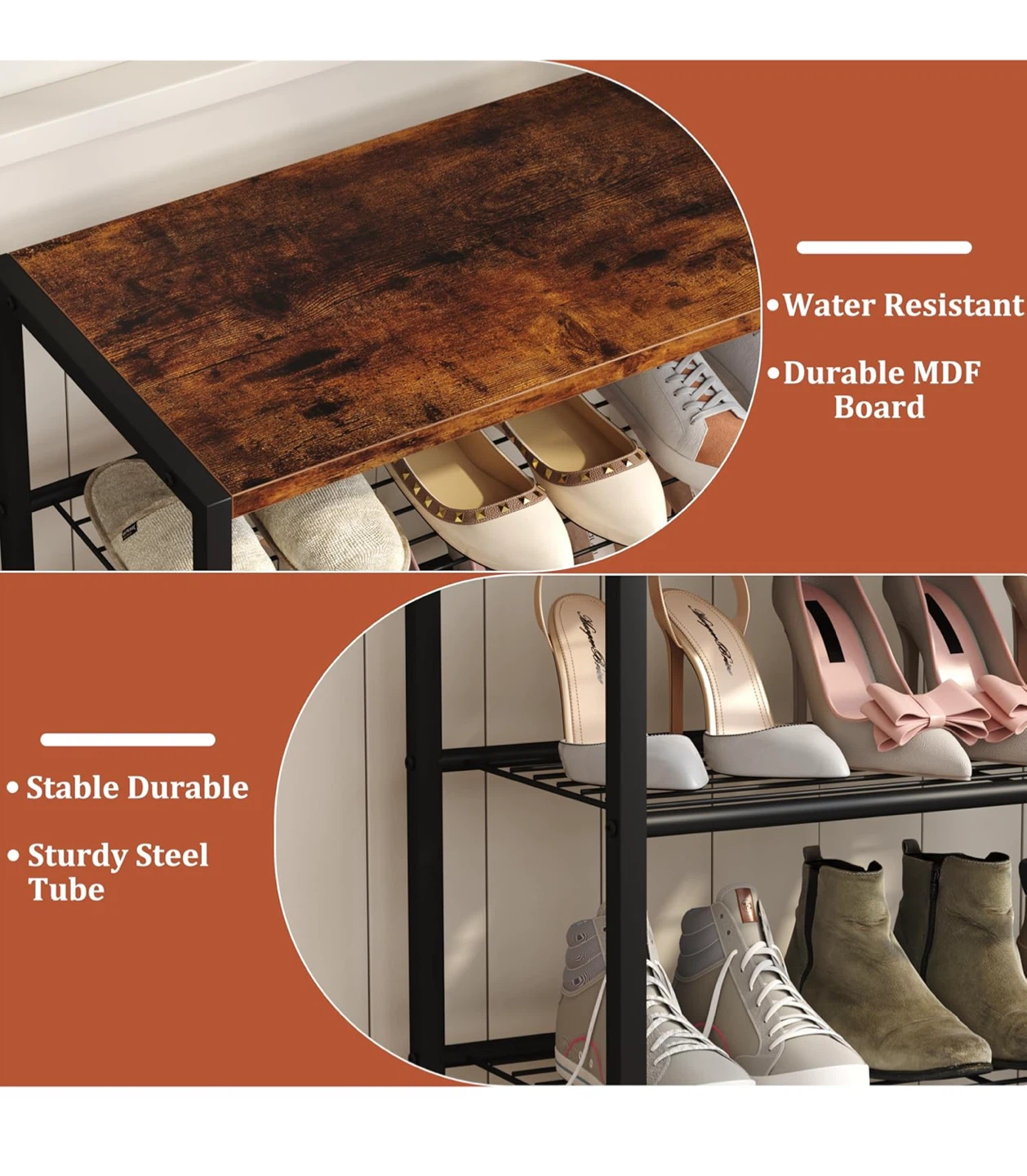 This sturdy shoe rack and bench combo is perfect for organizing your entryway or closet! It features a rustic brown top and a durable black metal frame. The dimensions are 65" x 24.8" x 11.8". The top is water-resistant MDF, and the frame is made of sturdy steel tubes