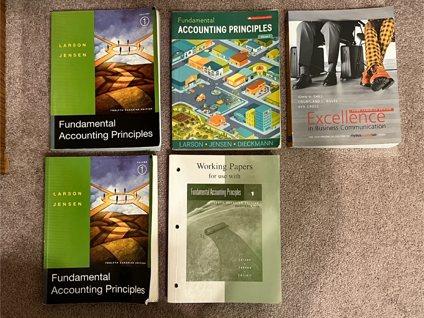 Selling a few accounting and business communication textbooks. They are Larson Jensen Fundamental Accounting Principles (Volume 1, Twelfth Canadian Edition), Larson Jensen Dieckmann Fundamental Accounting Principles (Volume 1, Fifteenth Canadian Edition), Larson Jensen Carroll Working Papers for use with Fundamental Accounting Principles (Tenth Canadian Edition, Chapters 1-11), and John V. Thill Courtland L. Bovee Ava Cross Excellence in Business Communication (Third Canadian Edition)