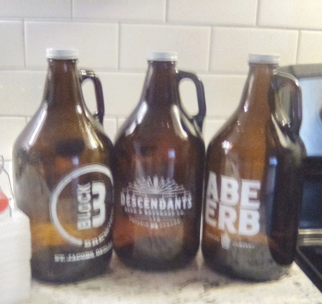 Set of three craft beer growlers from local brewers, perfect for homebrewing enthusiasts or collectors. These used growlers each have a 64oz capacity and feature distinctive logos from Block 3 Brewing, Descendants Beer & Beverage Co, and Abe Erb.