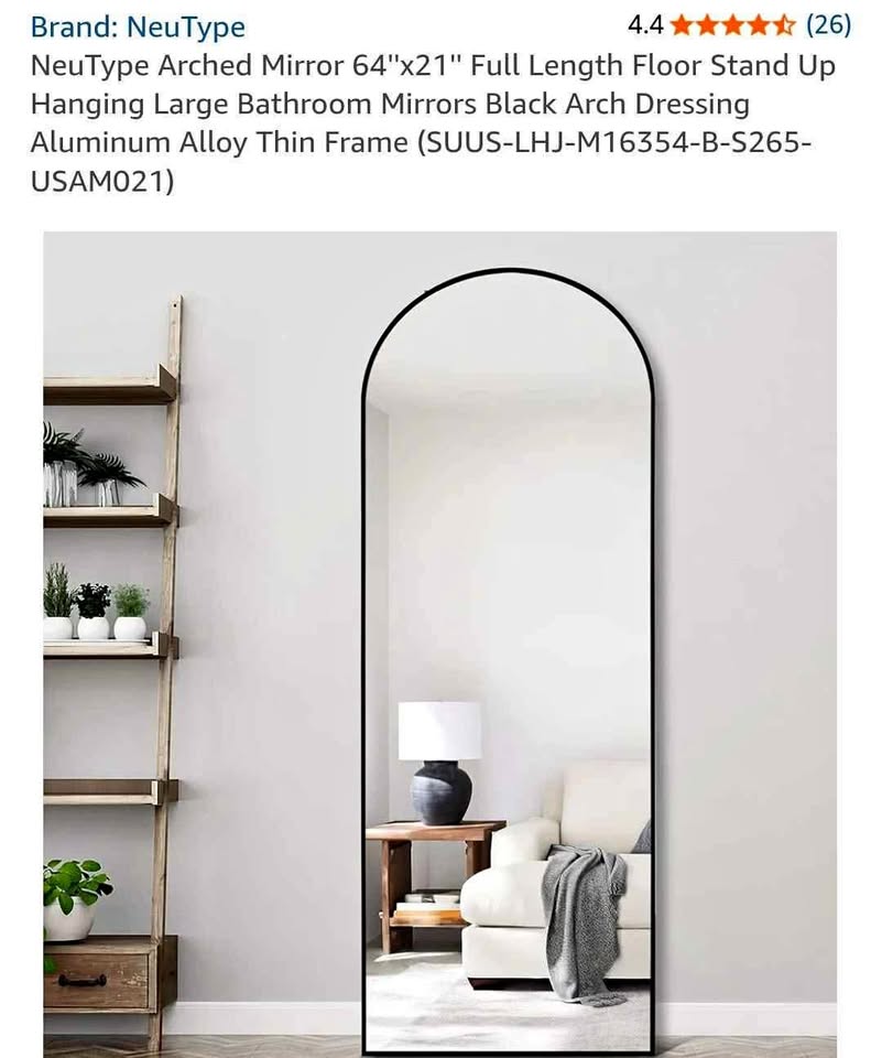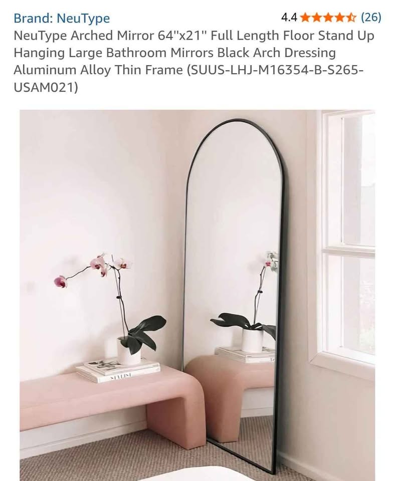 Large arched dressing mirror measures H-64" X W-21". Thin frame is made of high quality aluminum alloy with anti-rust treatment. Durable with black matte surface. Splash-proof and explosion-proof film. The arched design can also be used as decoration in your room.