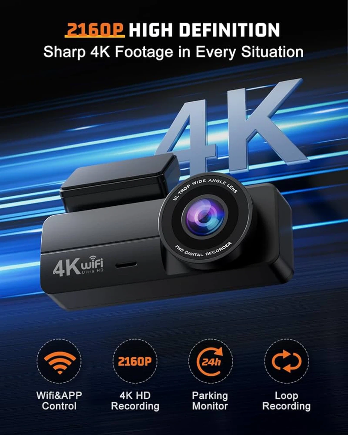 38Selling a brand new, never used 4K WiFi Ultra HD Dual Dash Cam! This dash cam comes in its original box with a user manual. Key features include: - 2160P High Definition for sharp 4K footage - WiFi & App Control - Parking Monitor - Loop Recording