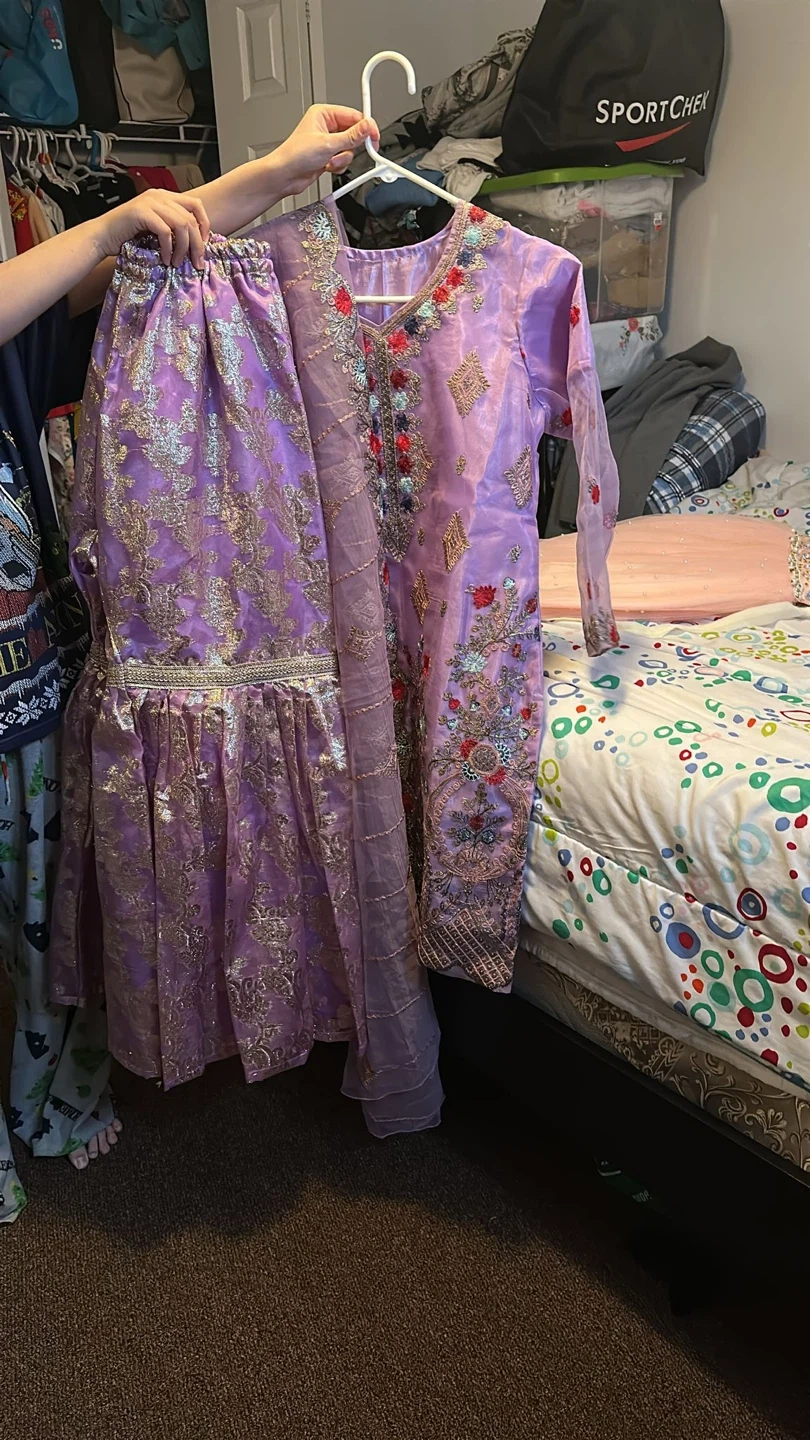 Two beautiful embroidered salwar kameez suits. One is a vibrant lilac with intricate gold patterns and colourful embellishments. The other is a soft peach with detailed floral embroidery. Both come with matching dupattas.