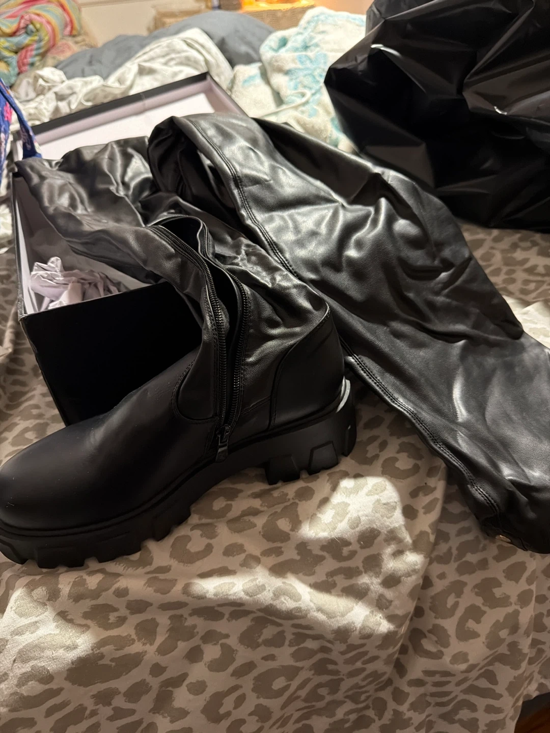 Selling a pair of black thigh-high boots! They are in great condition and come with the box. These boots are perfect for adding a stylish touch to any outfit