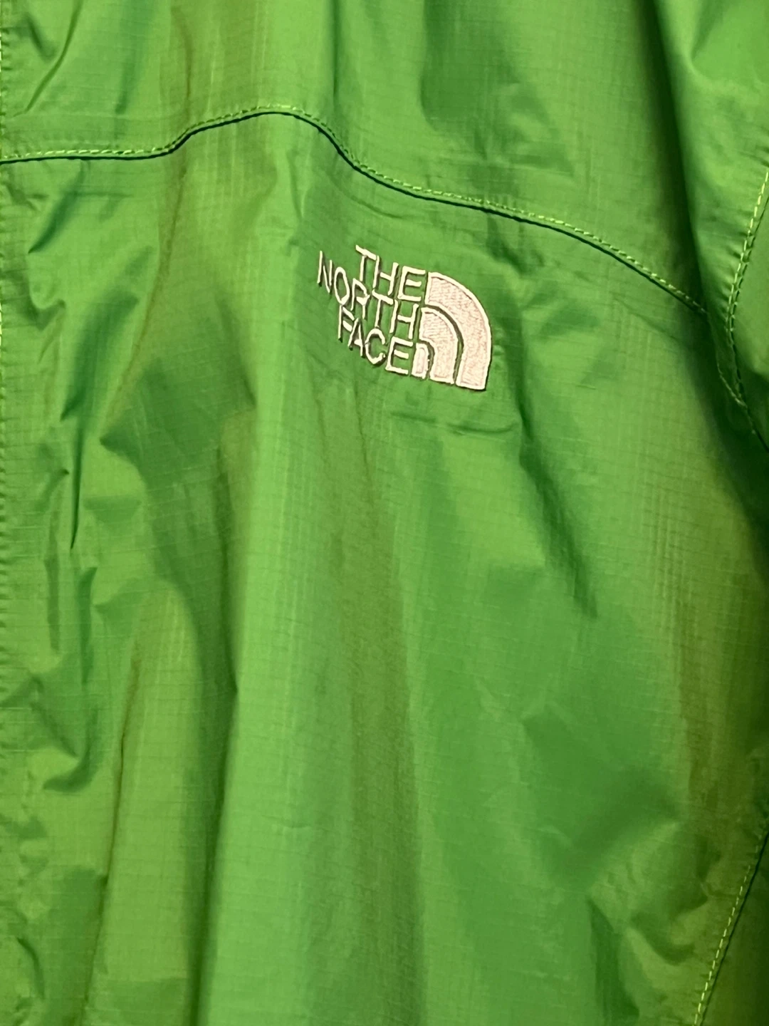 This is a green hooded rain jacket from The North Face. It's made of waterproof material and features a full zip closure with a drawstring hem. Great for keeping dry on the go!