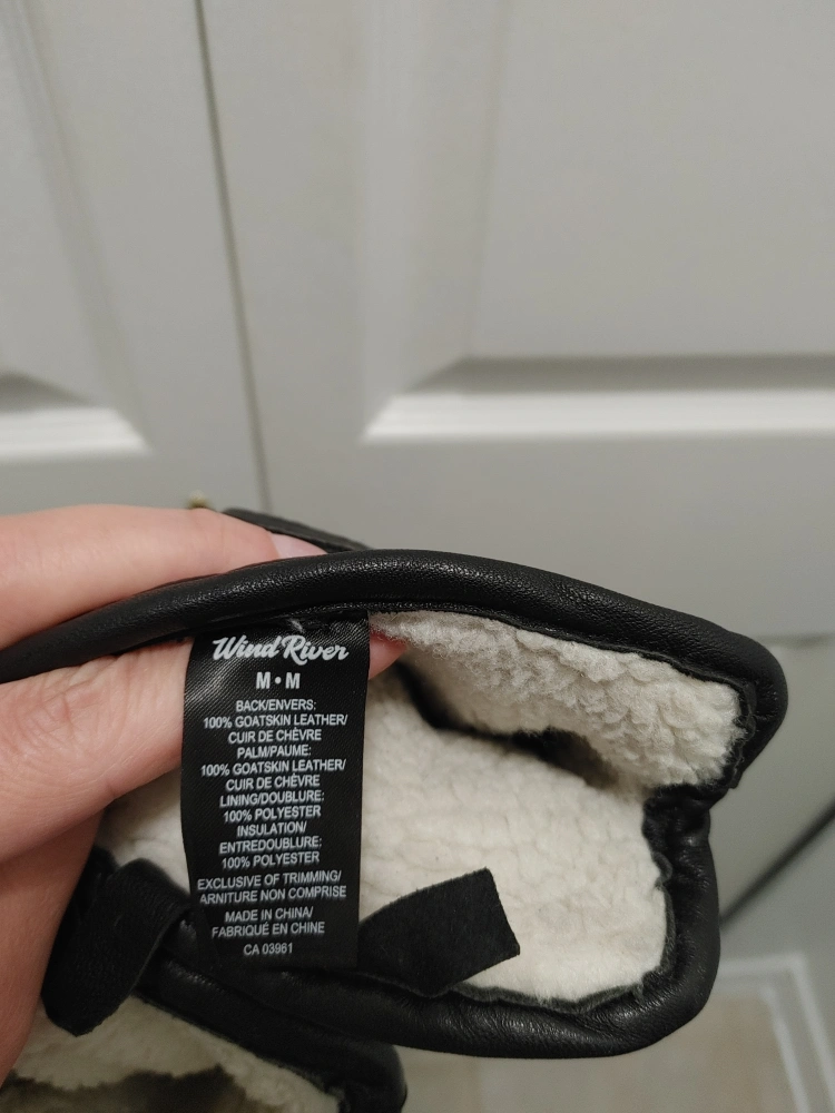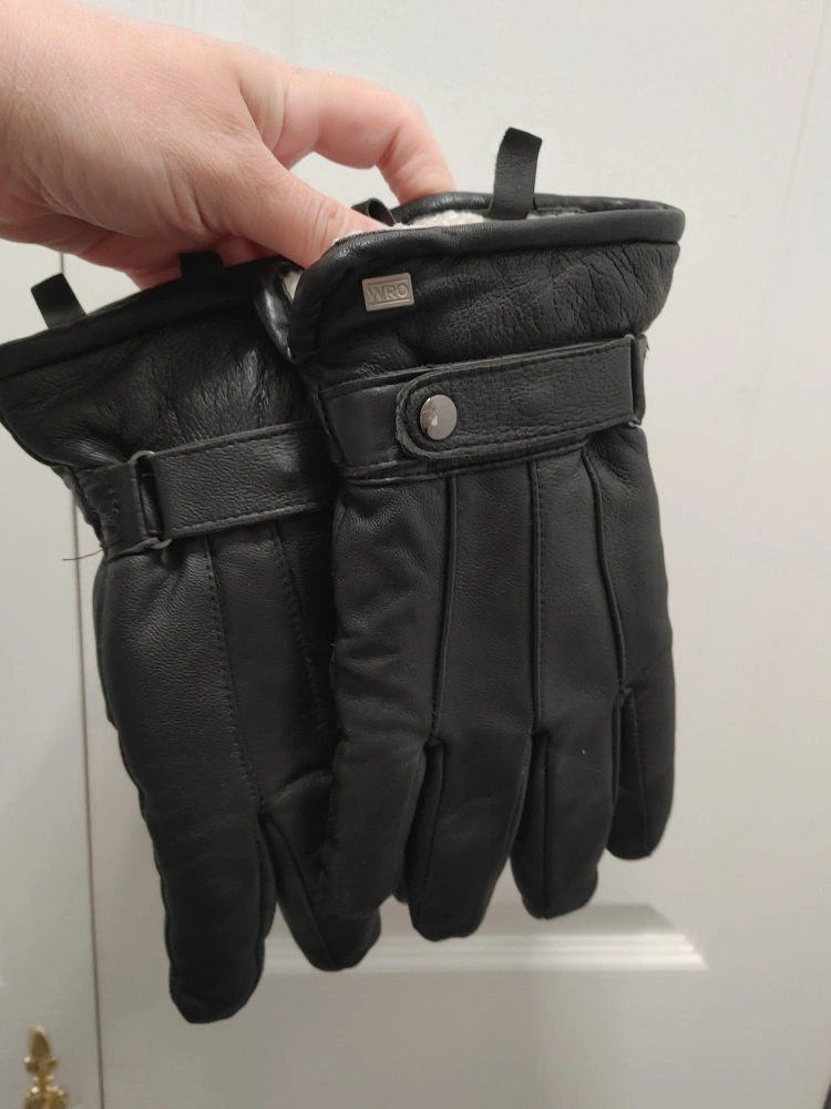 Here are some black 100% goatskin leather gloves! They have a buckle design on the wrist and a soft lining inside. Good for keeping your hands warm during the colder months