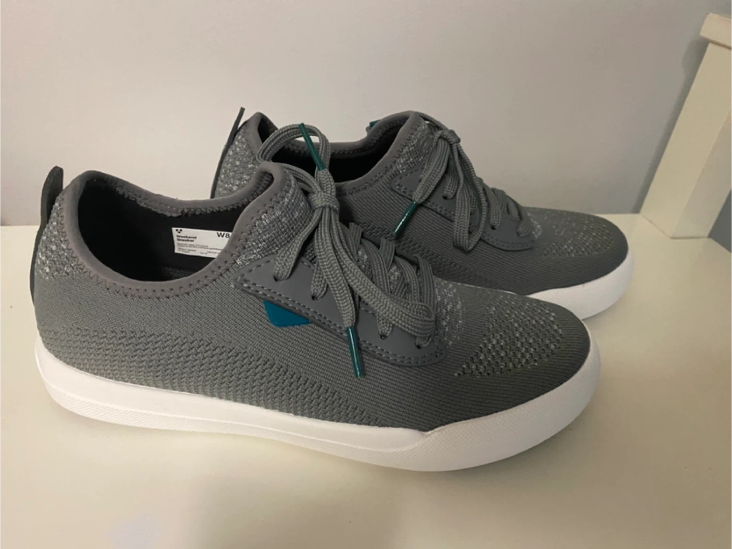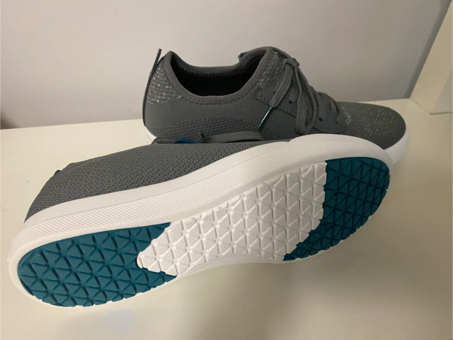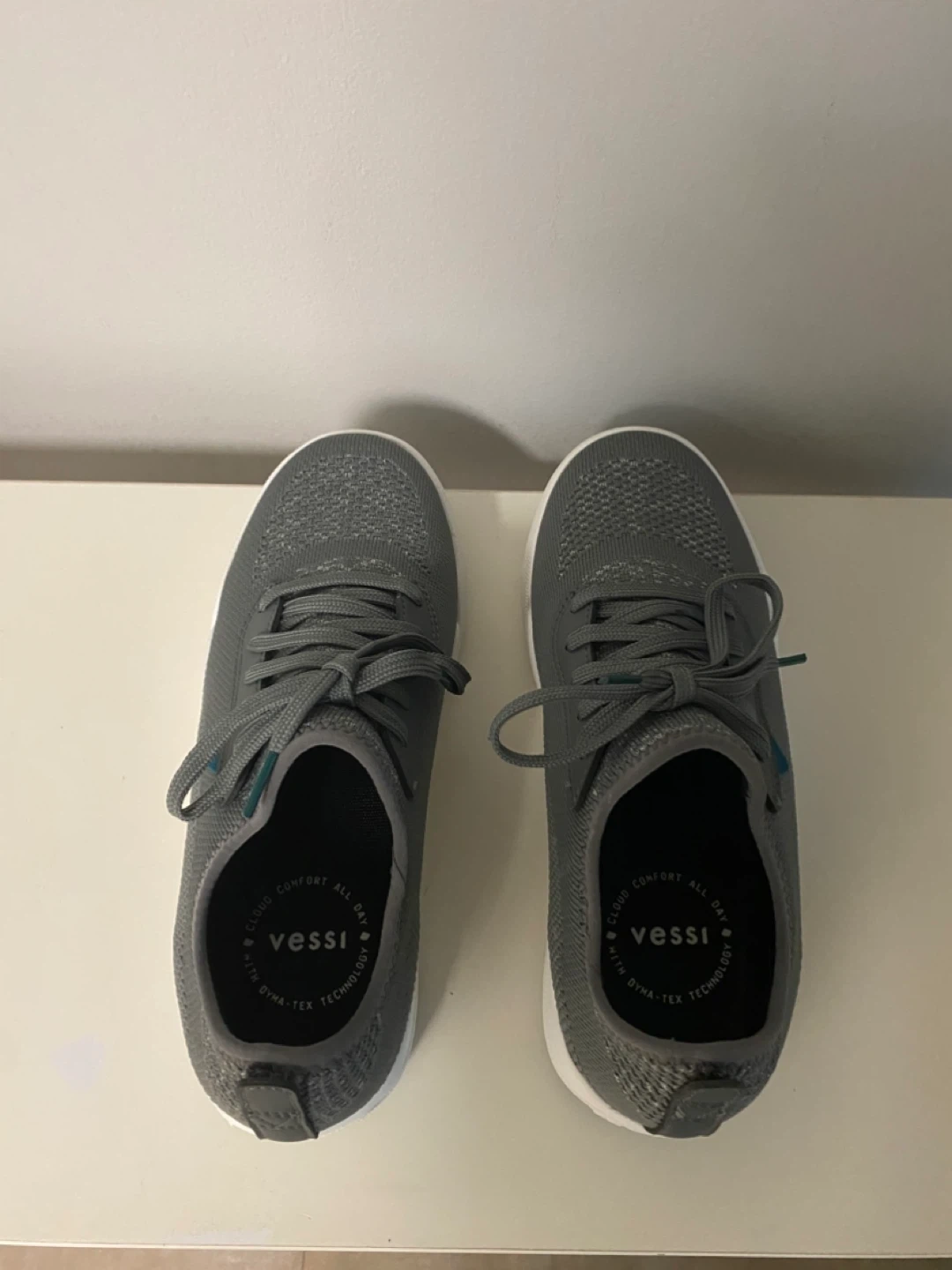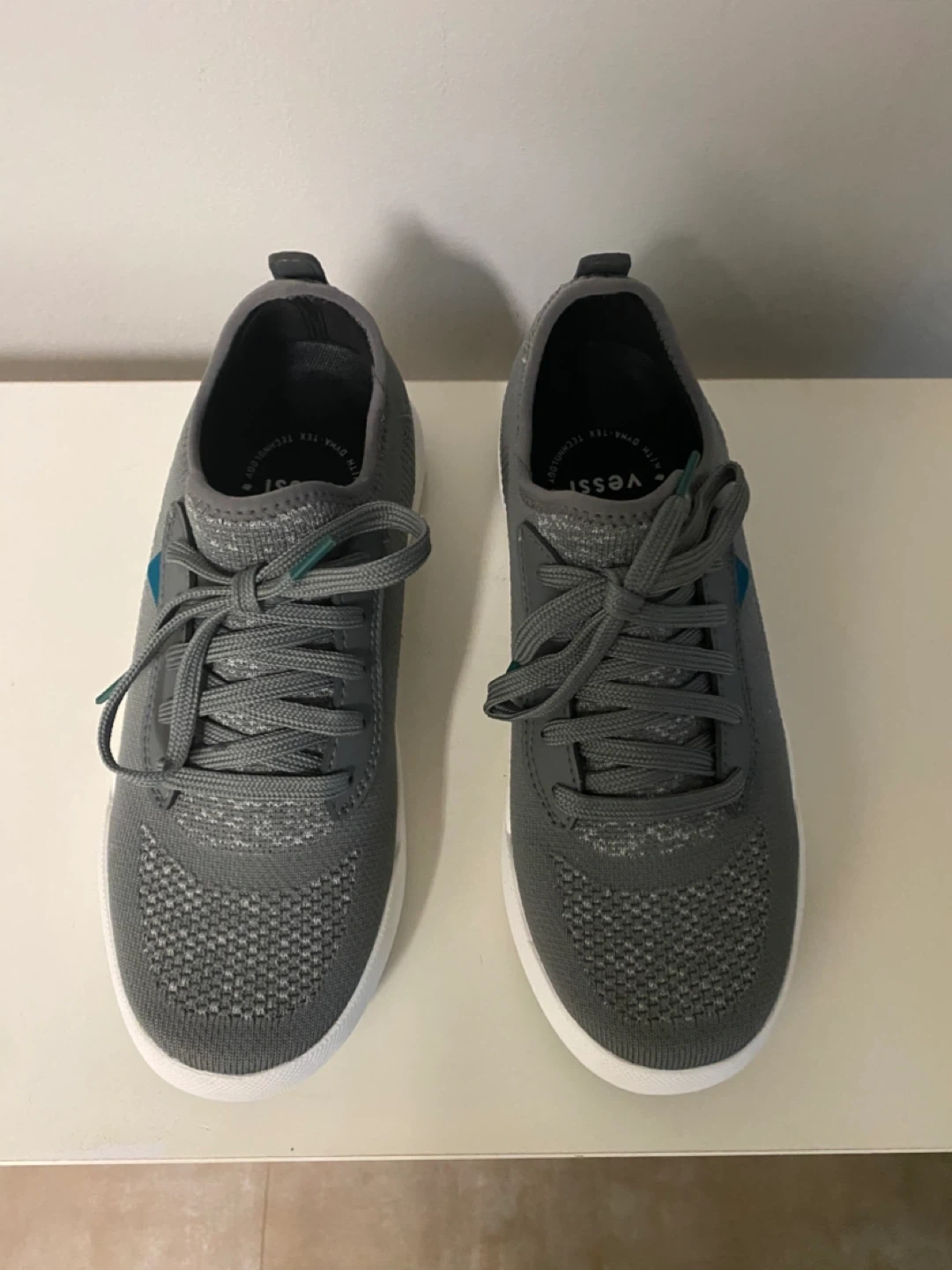 These Vessi shoes feature grey mesh uppers with teal accents. They're designed for cloud comfort all day with Dyna-Tex technology. The soles have a non-slip pattern for good traction.