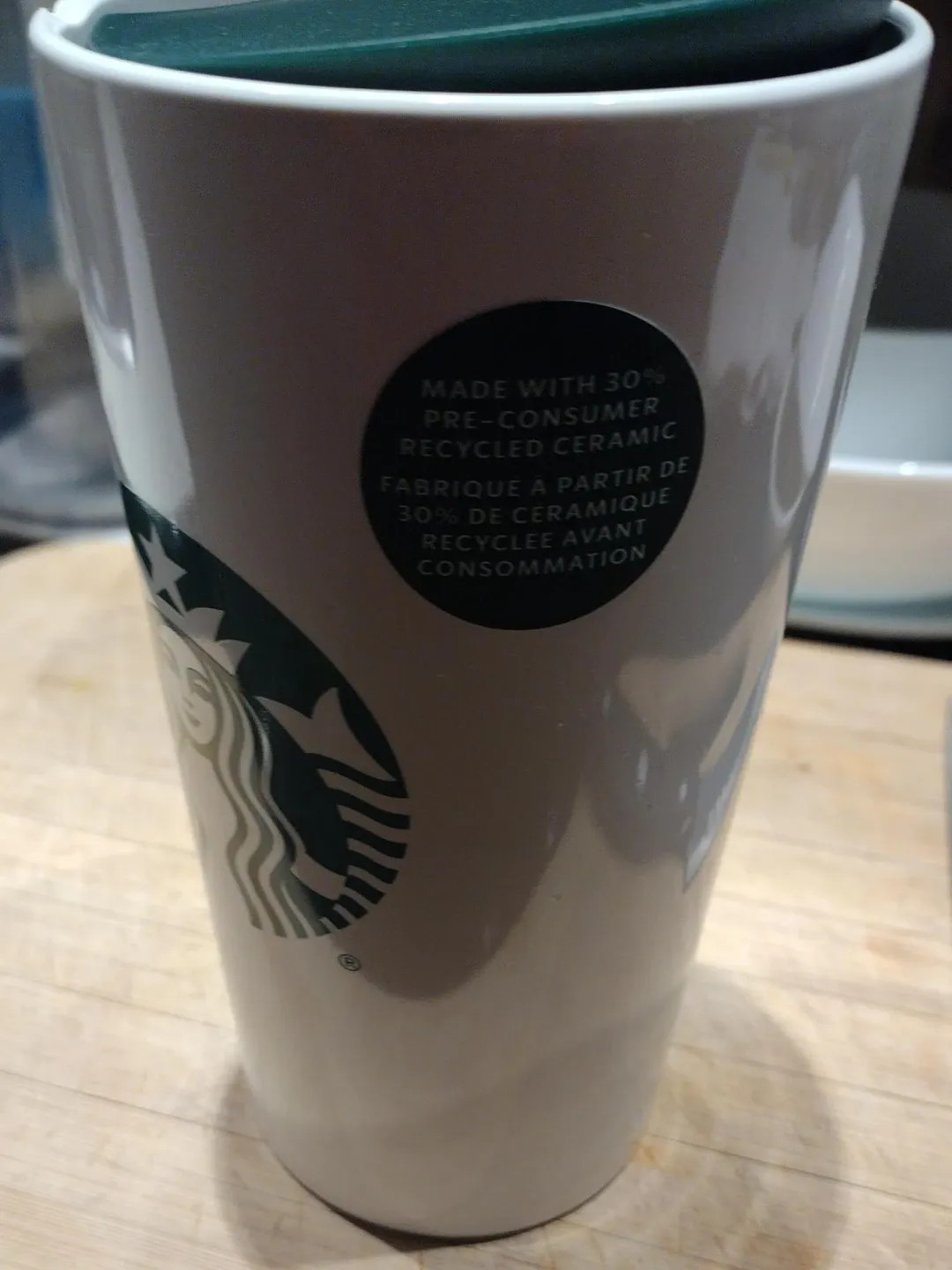 This Starbucks travel mug is made with 30% pre-consumer recycled ceramic. It's a reusable mug, perfect for your daily commute or when you're on the go. The lid helps prevent spills.