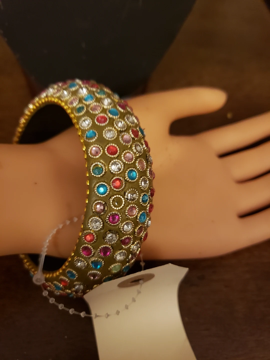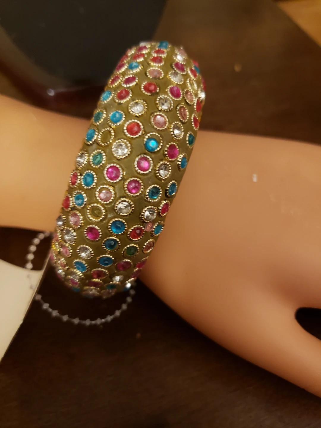 This decorative bangle bracelet features a gold-tone finish. It's covered in an array of colourful rhinestones in shades of pink, blue, and red. This piece adds a vibrant pop to any outfit!