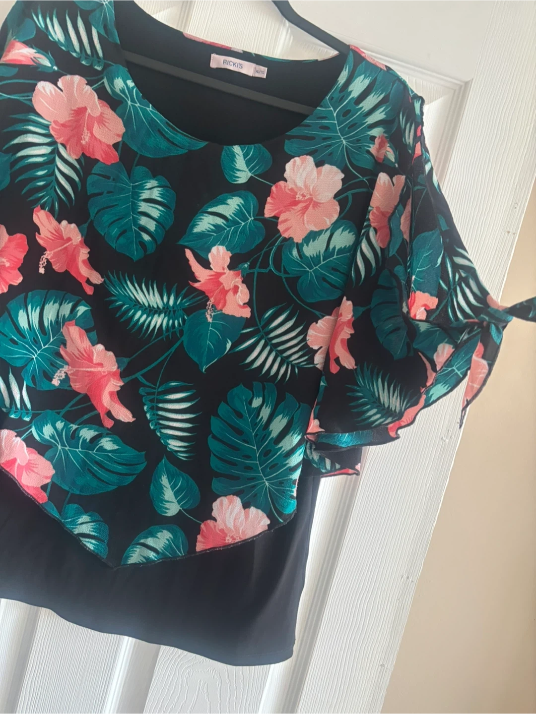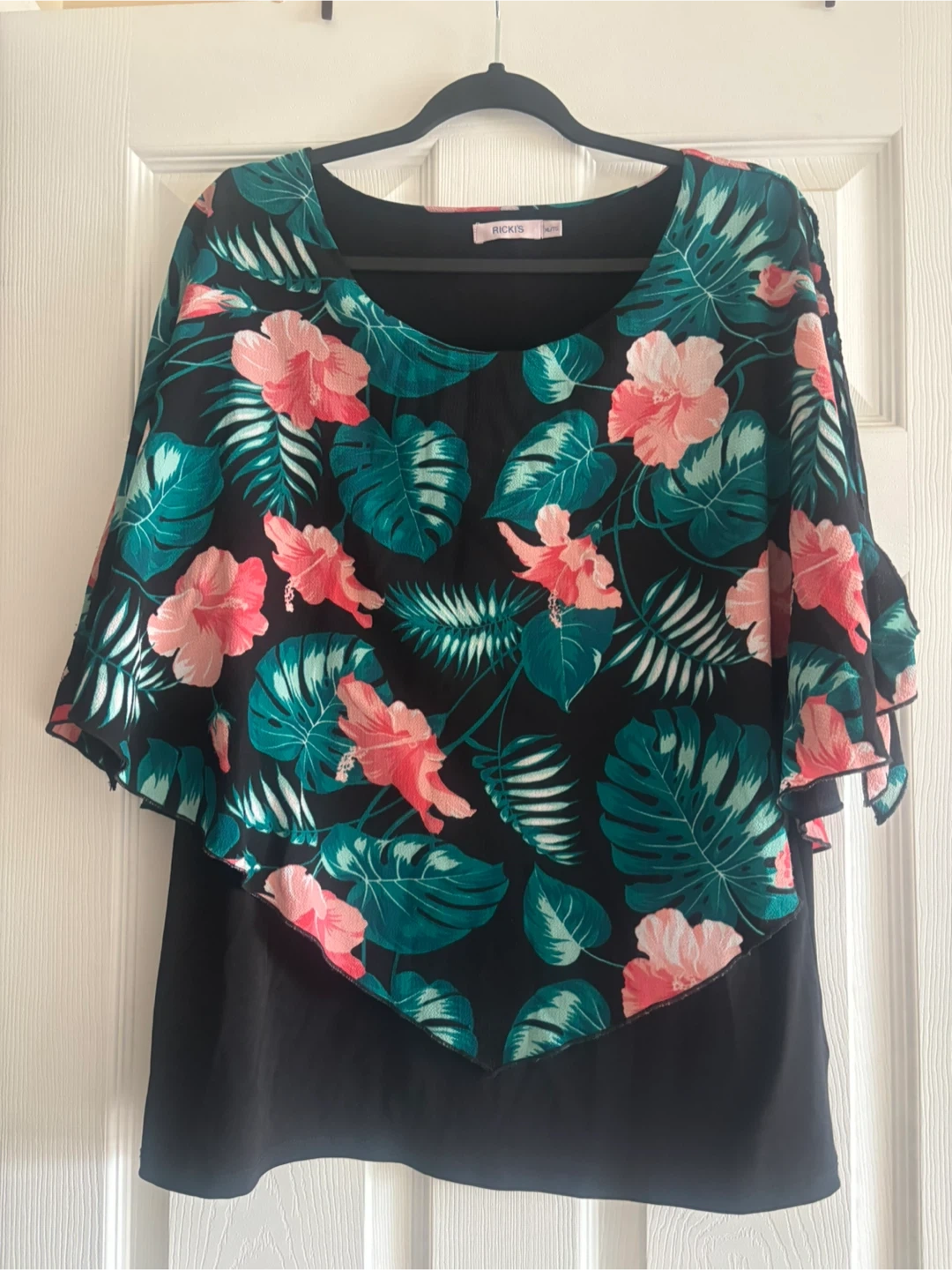 This Rickis blouse features a vibrant tropical print with pink hibiscus flowers and green leaves. It has a layered effect with flutter sleeves and tie details. This top is perfect for adding a pop of colour to your wardrobe!