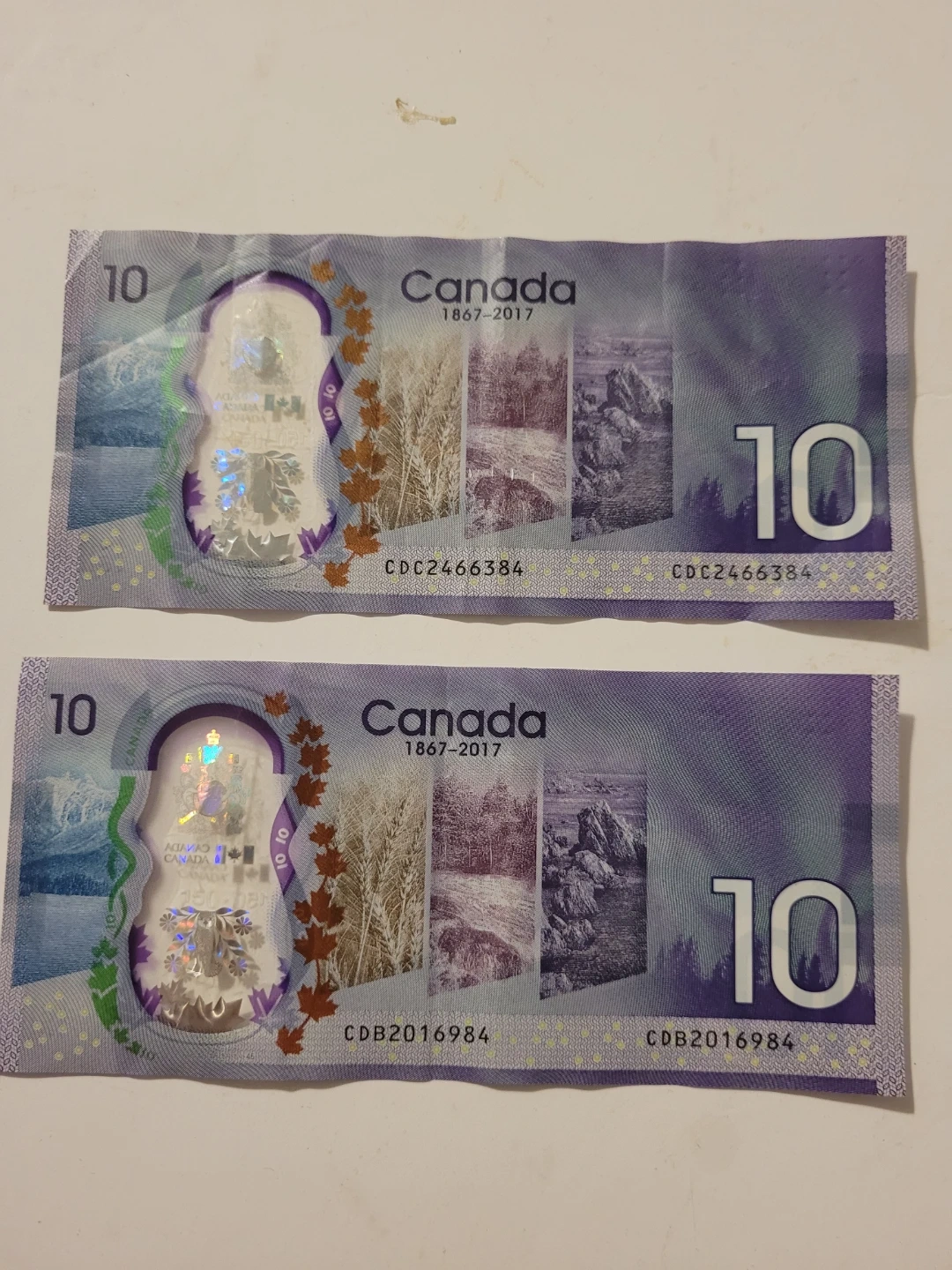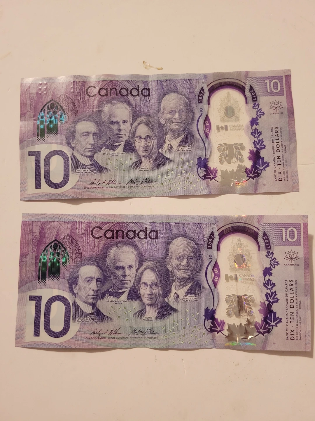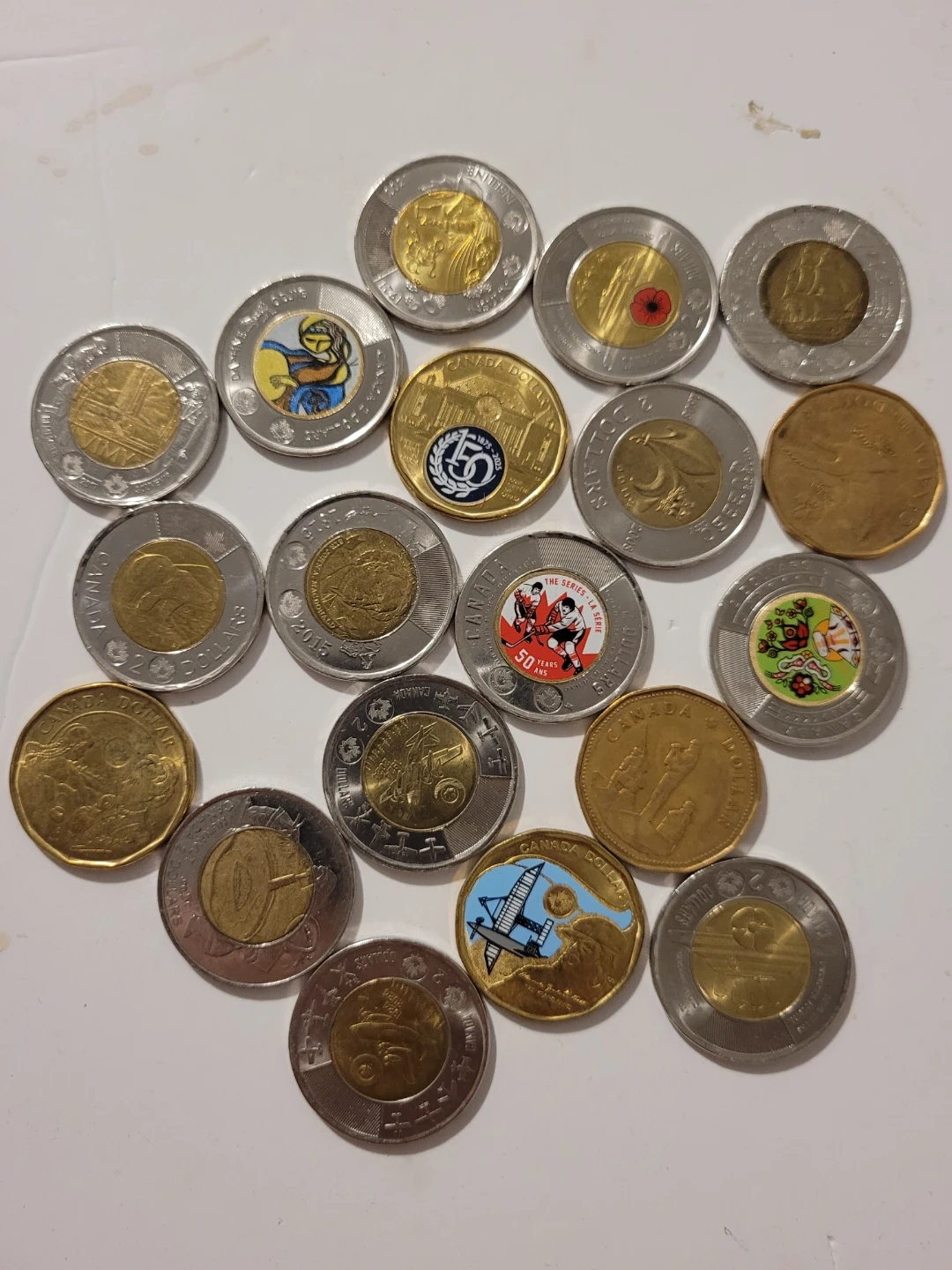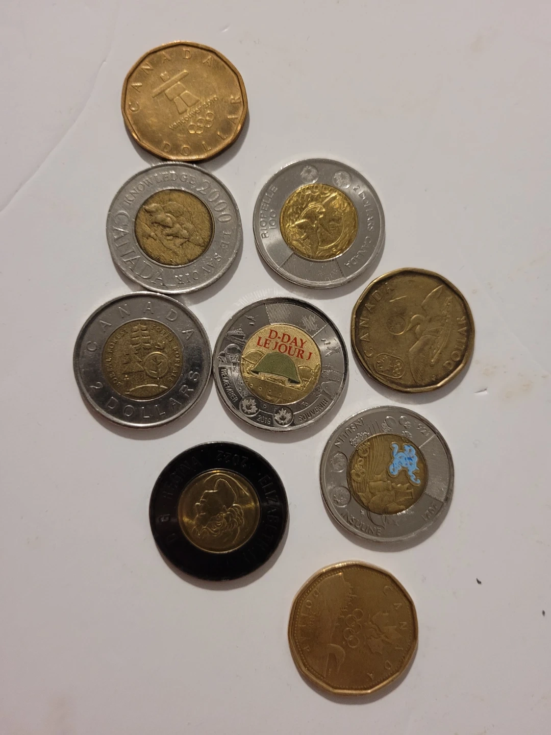 A collection of various Canadian coins, including loonies and toonies, and two Canadian ten-dollar banknotes. The banknotes are from the 1867-2017 series. The bills are 30 each and the toonies are 8 each and loonies 6 each have different coins send me pictures of ones you need i might have and price is firm