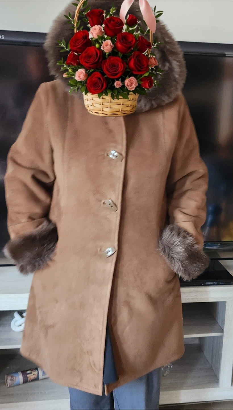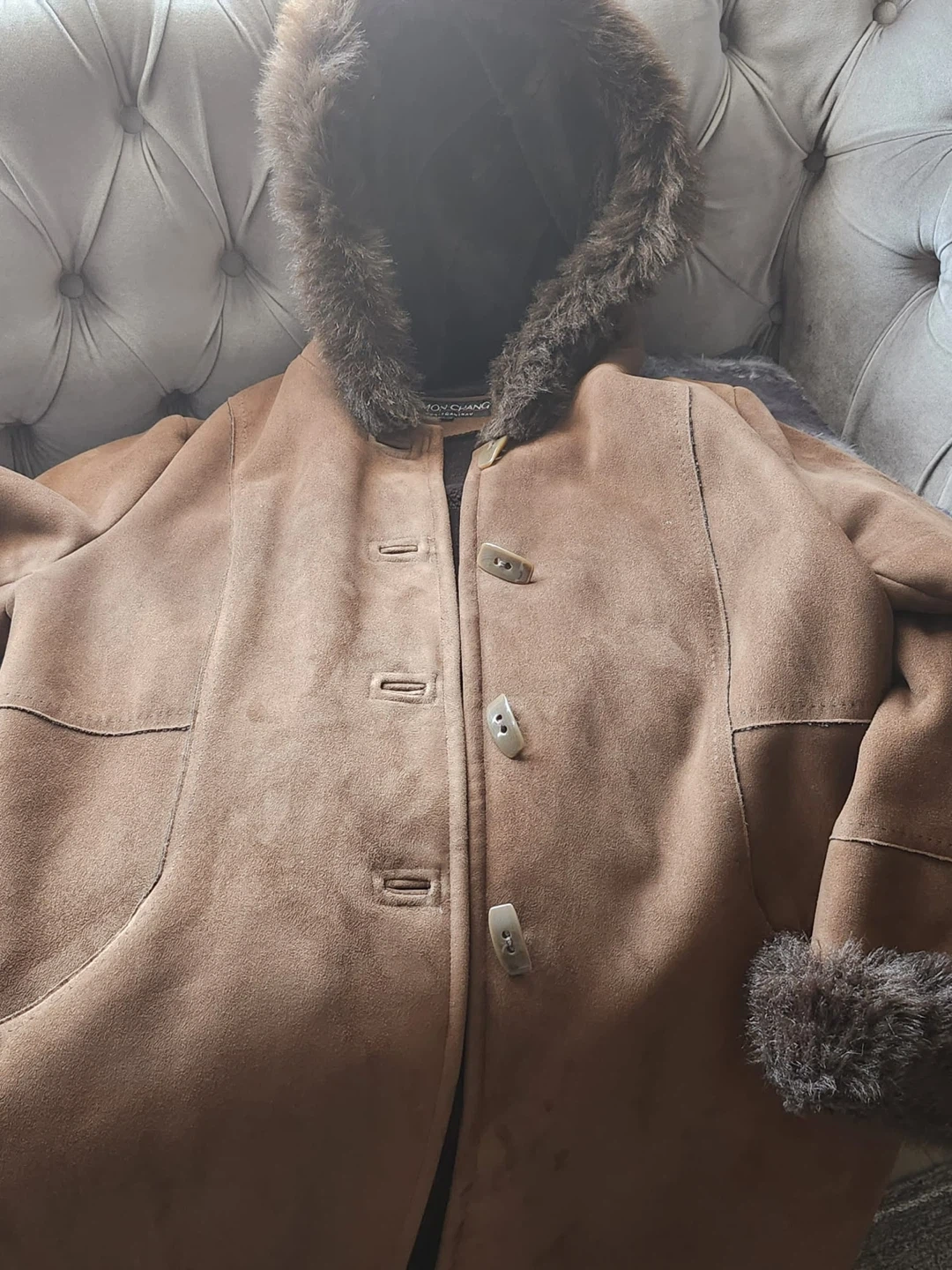 Warm brown coat with a faux suede exterior and faux fur trim on the hood and cuffs. It features toggle button closures and a cozy hood. This coat is perfect for staying stylish and warm during colder weather!