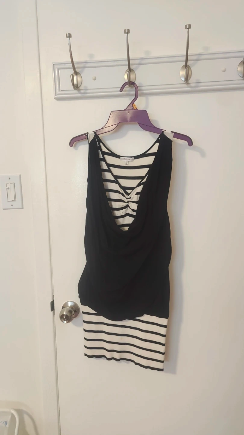 This Mimi & Lily tank top has a black overlay with a cowl neck design. It features a black and white striped body and back. It's a comfortable and stylish piece for layering or wearing on its own.