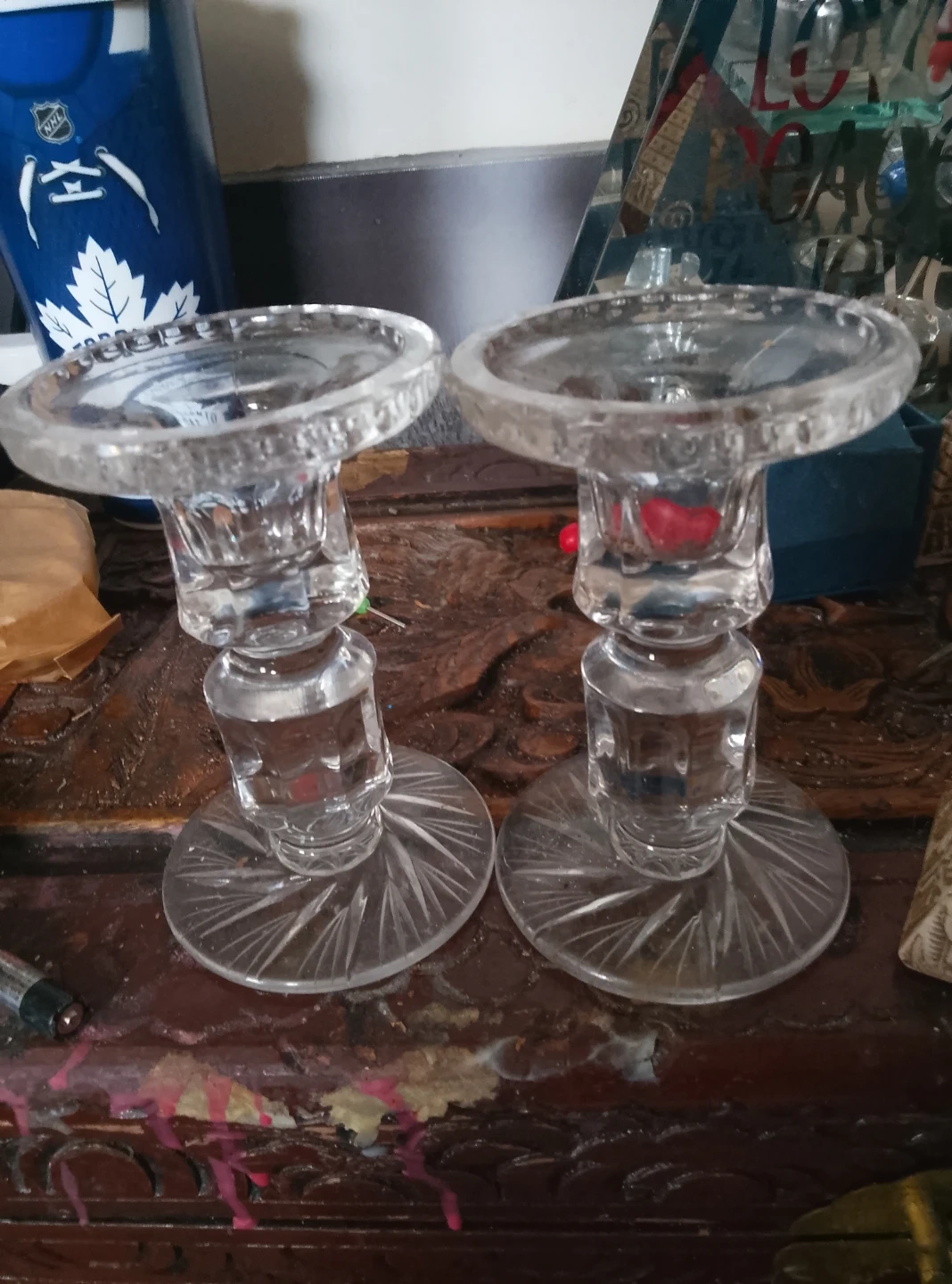 Two clear glass taper candle holders with a starburst design on the base. These holders are made of crystal-clear glass and have a classic, elegant look. They're perfect for adding a touch of ambiance to any room. Use these for special occasions or everyday dining!