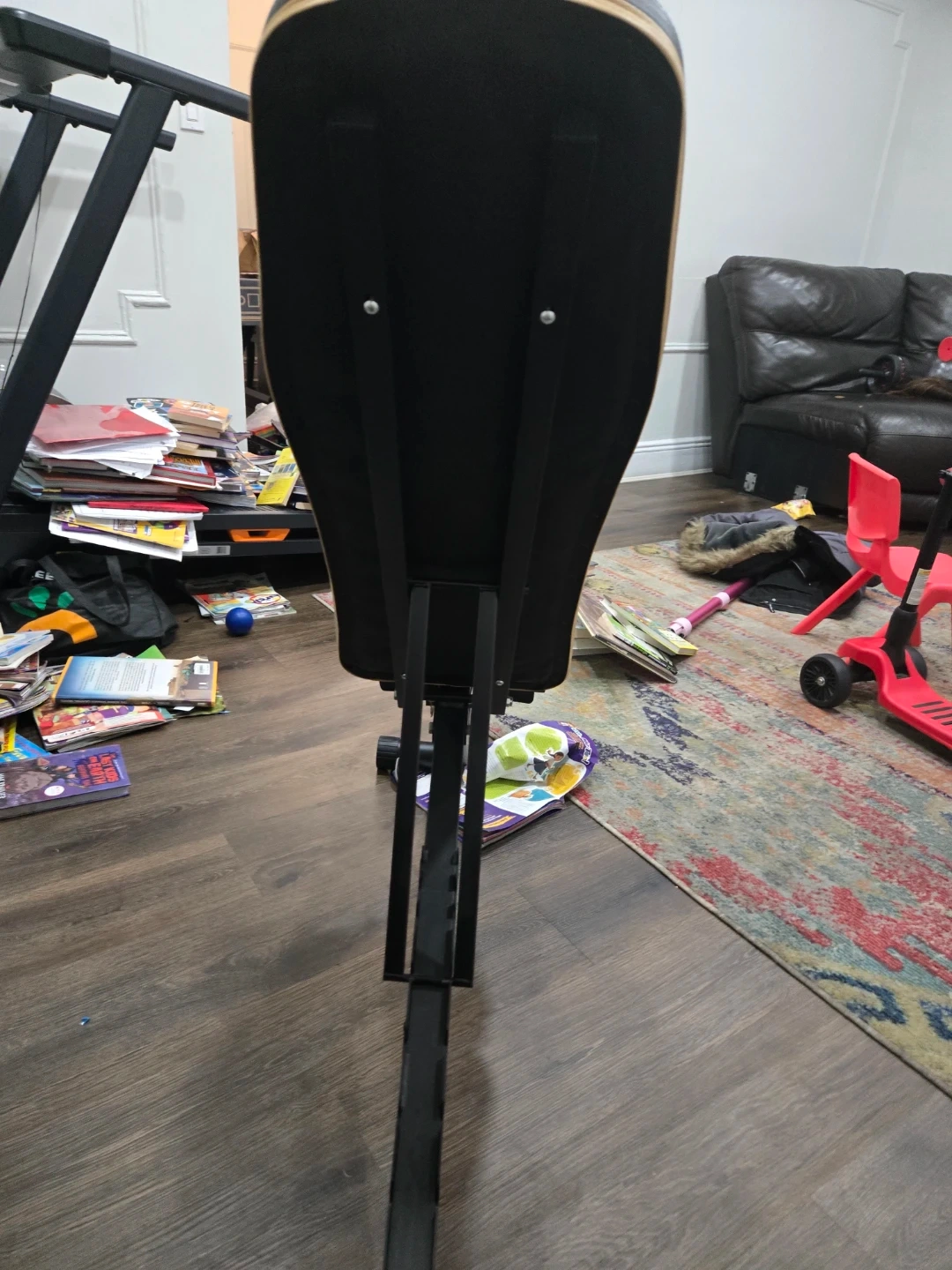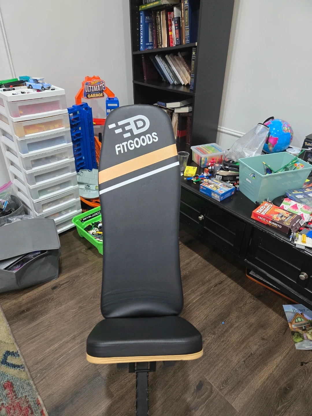 This is a FITGOODS adjustable weight bench. It's upholstered in black faux leather with a wood accent base. Perfect for home workouts! And NEW!