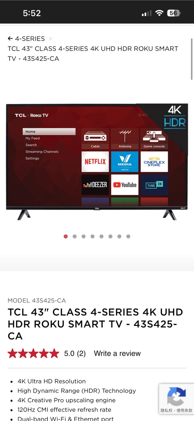 This TCL smart TV offers 4K Ultra HD resolution and High Dynamic Range (HDR) technology. It's a 43-inch Roku TV with a 120Hz CMI effective refresh rate. Dual-band Wi-Fi and an Ethernet port are included for connectivity.