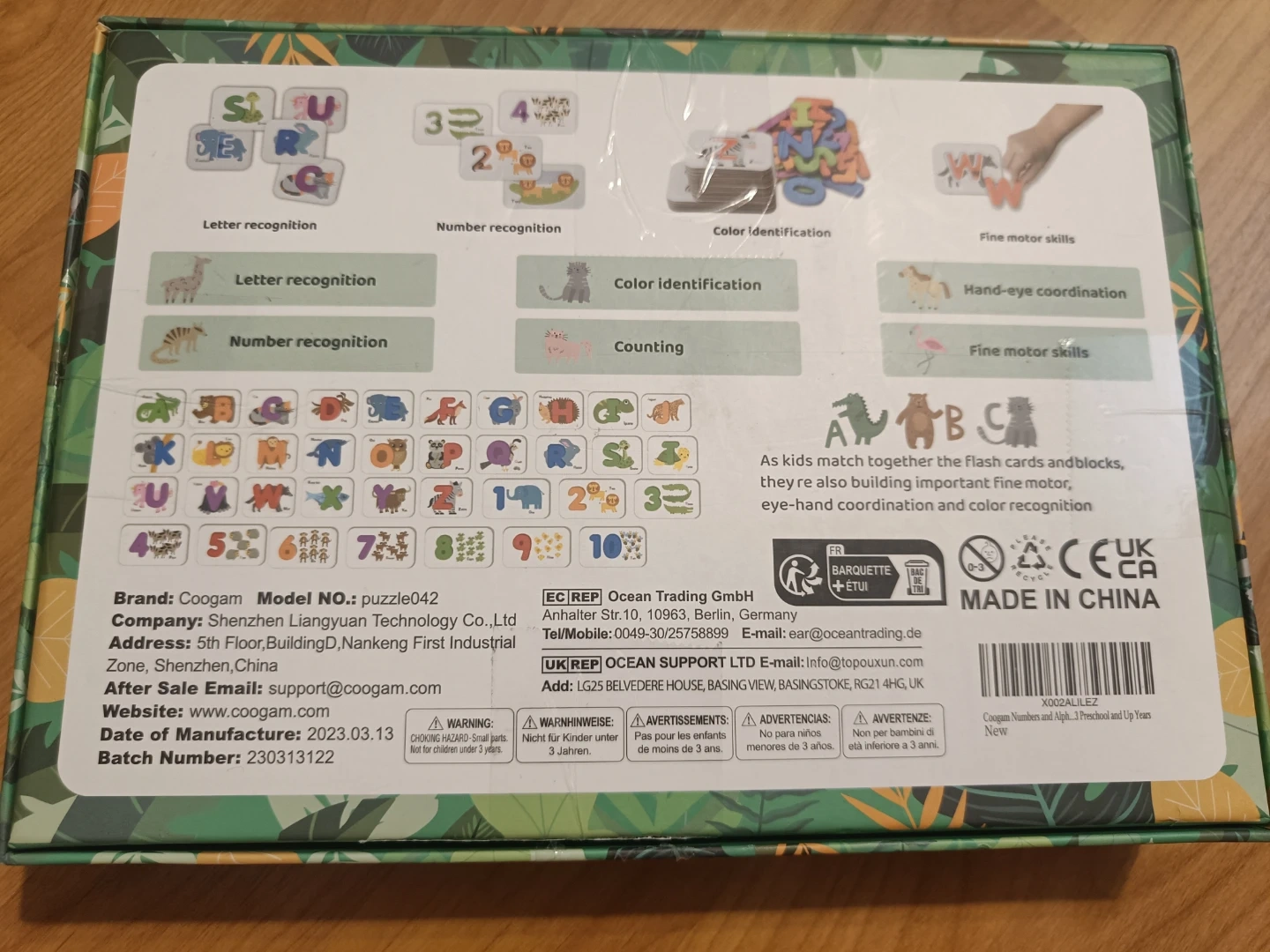 This Coogam flashcard set includes animal-themed cards and wooden letter and number blocks. It's designed for letter recognition, number recognition, and fine motor skills. Great for little ones learning their ABCs and 123s! Some parts are missing.