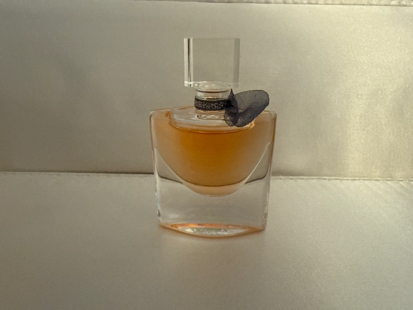 This is a bottle of Lancôme La Vie Est Belle Eau de Parfum. It's a floral fragrance with a hint of sweetness. The bottle has a ribbon detail at the neck. It is a miniature