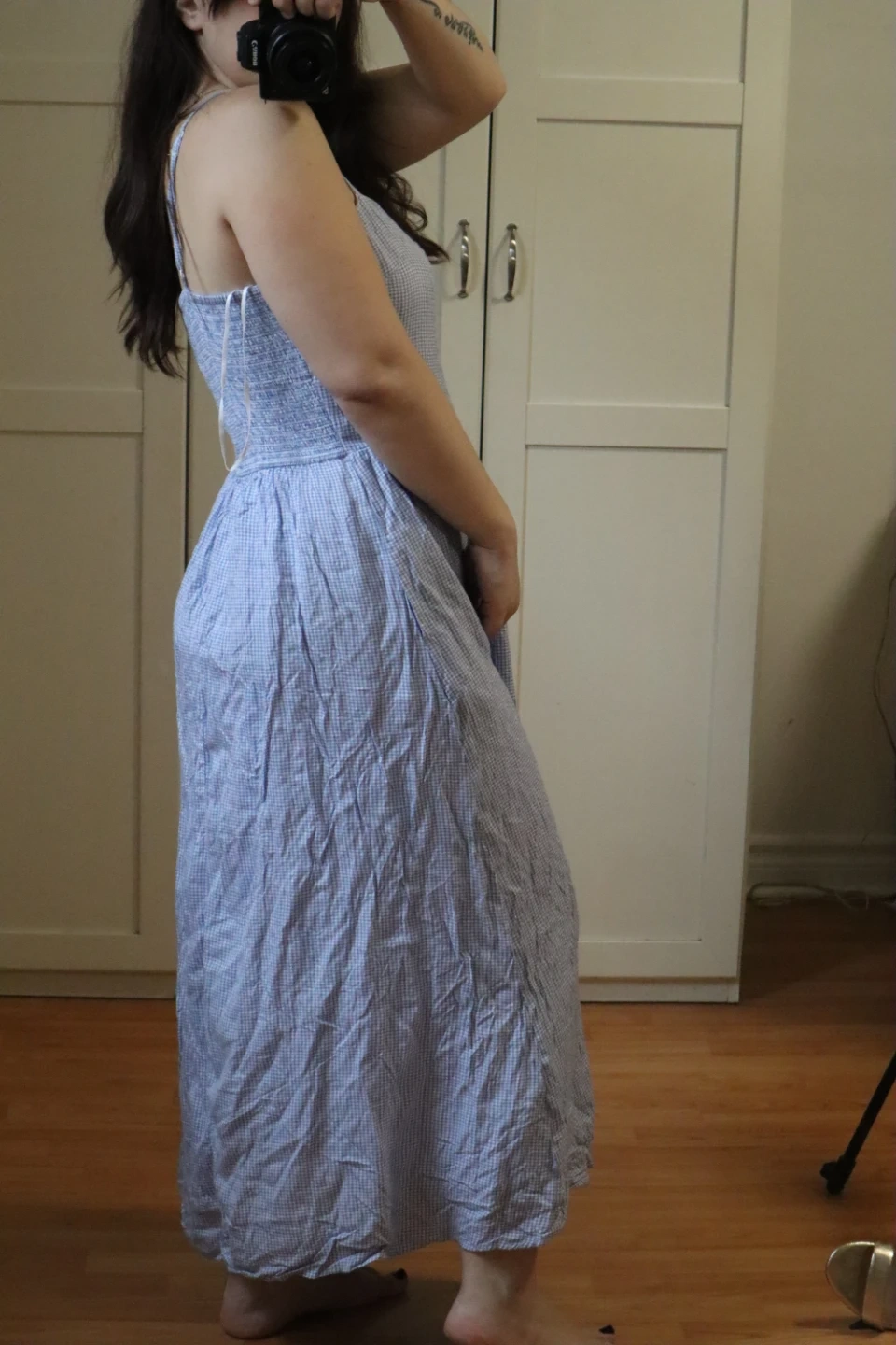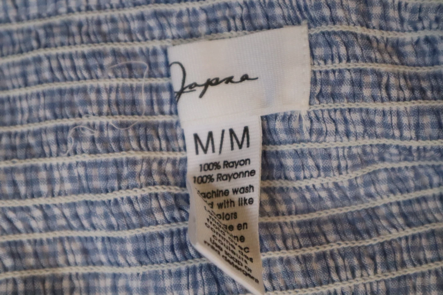 This Jopaa maxi dress features a blue gingham pattern and a shirred bodice. It's made of 100% rayon. Size is M/M. It's perfect for warm weather outings!