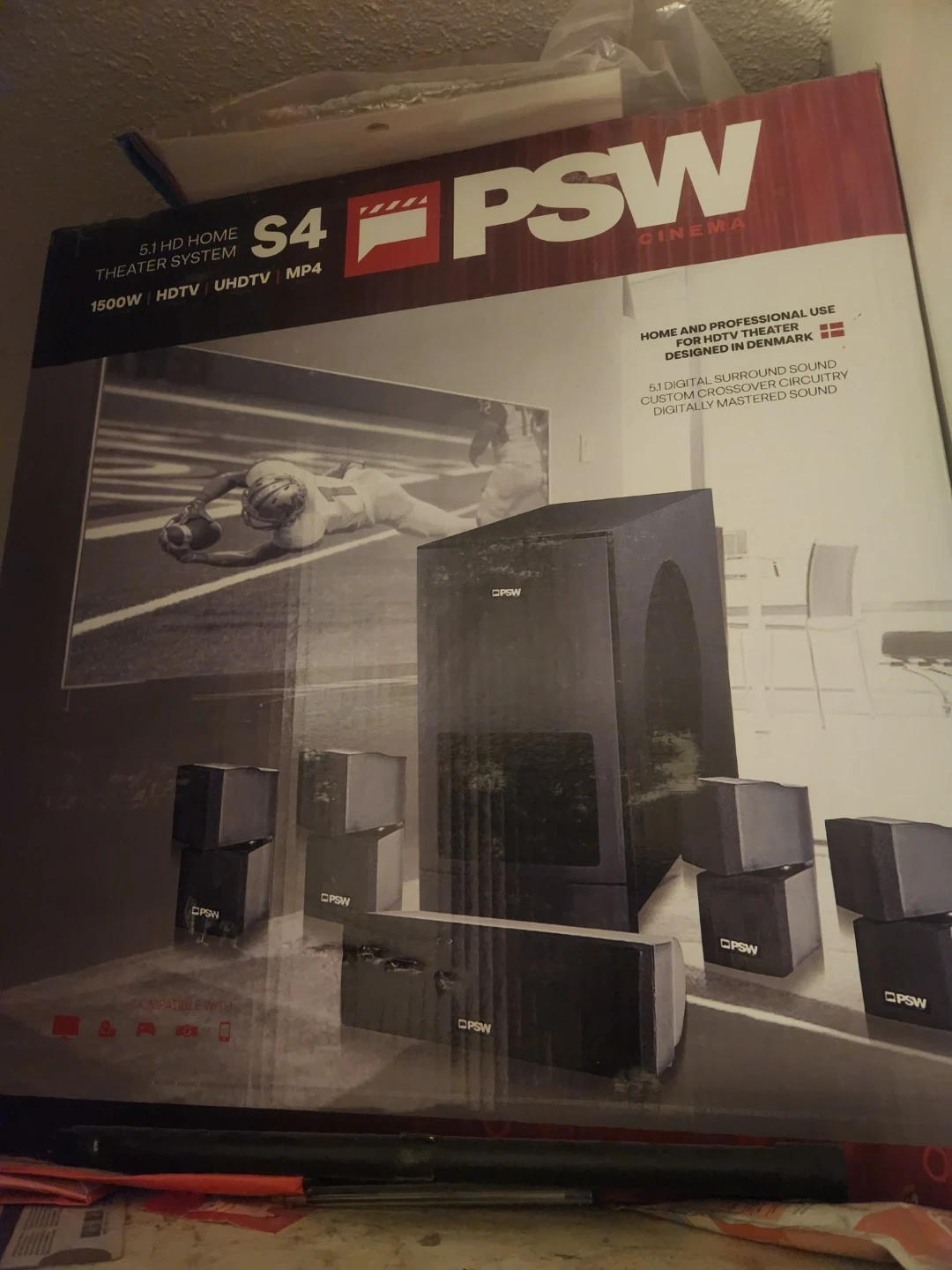 This is a PSW S4 5.1 HD Home Theater System. It features 1500W of power. Designed in Denmark, it offers 5.1 digital surround sound with custom crossover circuitry and digitally mastered sound. It's compatible with HDTV and UHDTV.