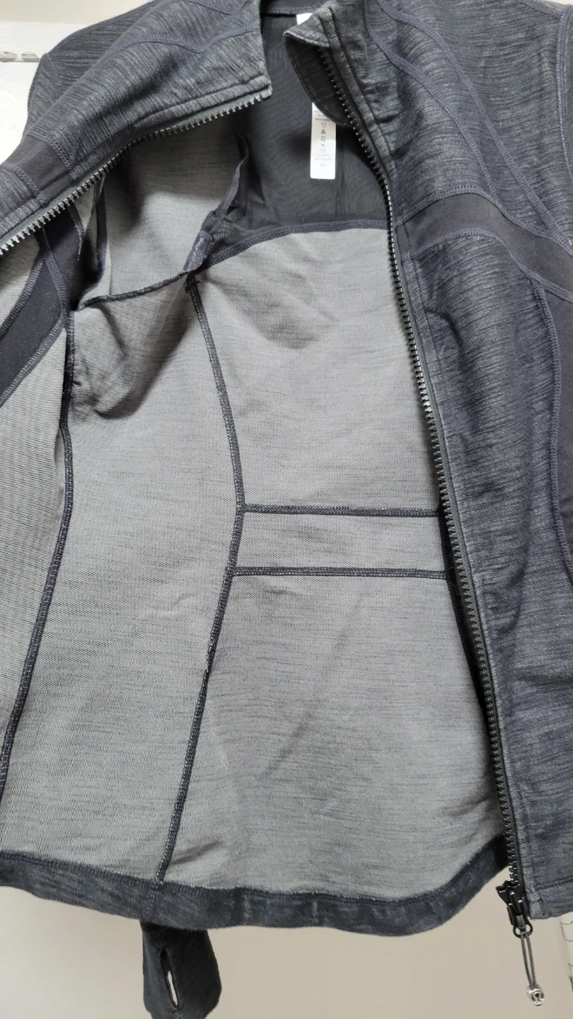This Lululemon Athletica zip-up jacket is charcoal heather in colour. It's made with 49% Polyester, 40% Nylon, and 12% Lycra Spandex for the body. The lining is 87% Polyester and 13% Spandex. It features thumbholes and zippered pockets.