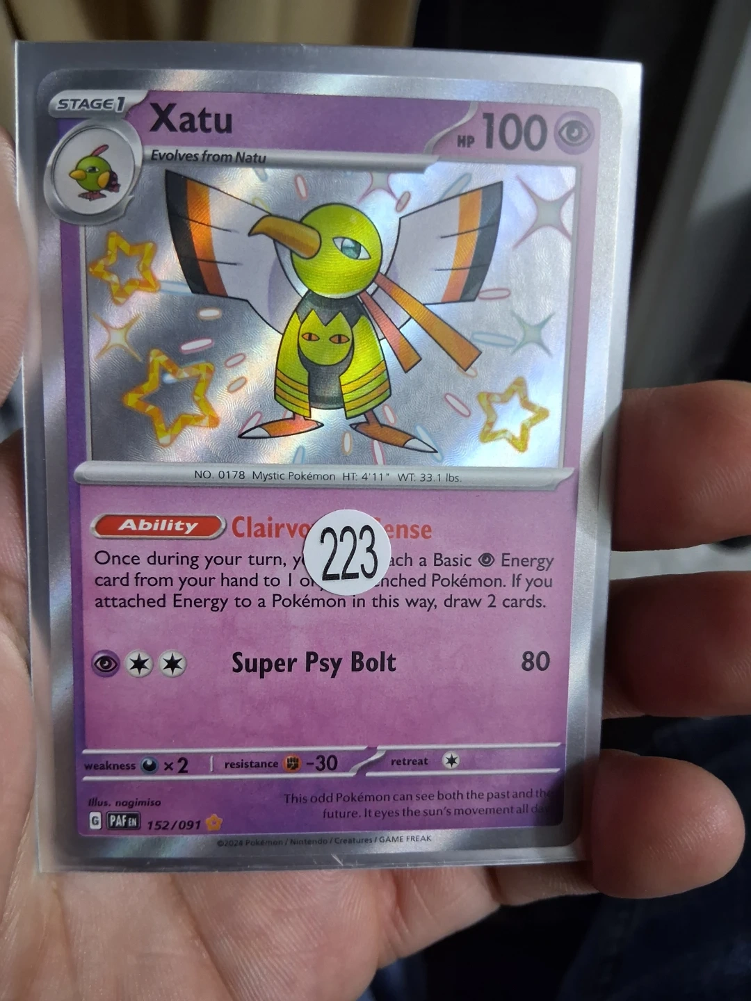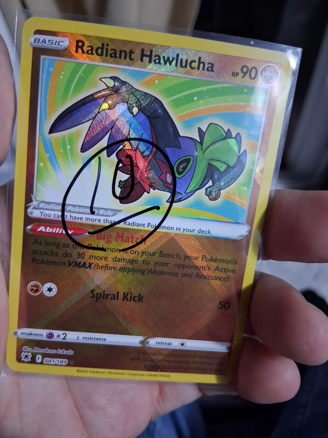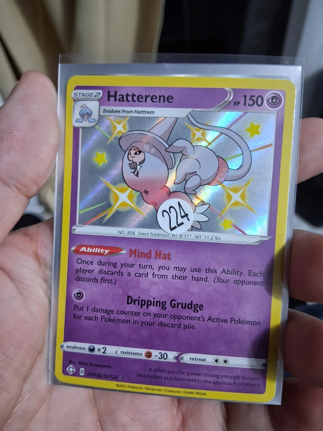 Bundle of various Pokemon trading cards including Hatterene, Xatu, Radiant Hawlucha, Radiant Tsareena, and Cramorant. These cards are great for collectors or players of the Pokemon TCG. Condition varies by card.