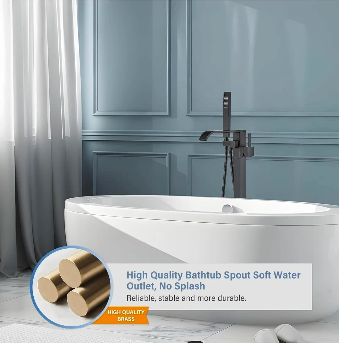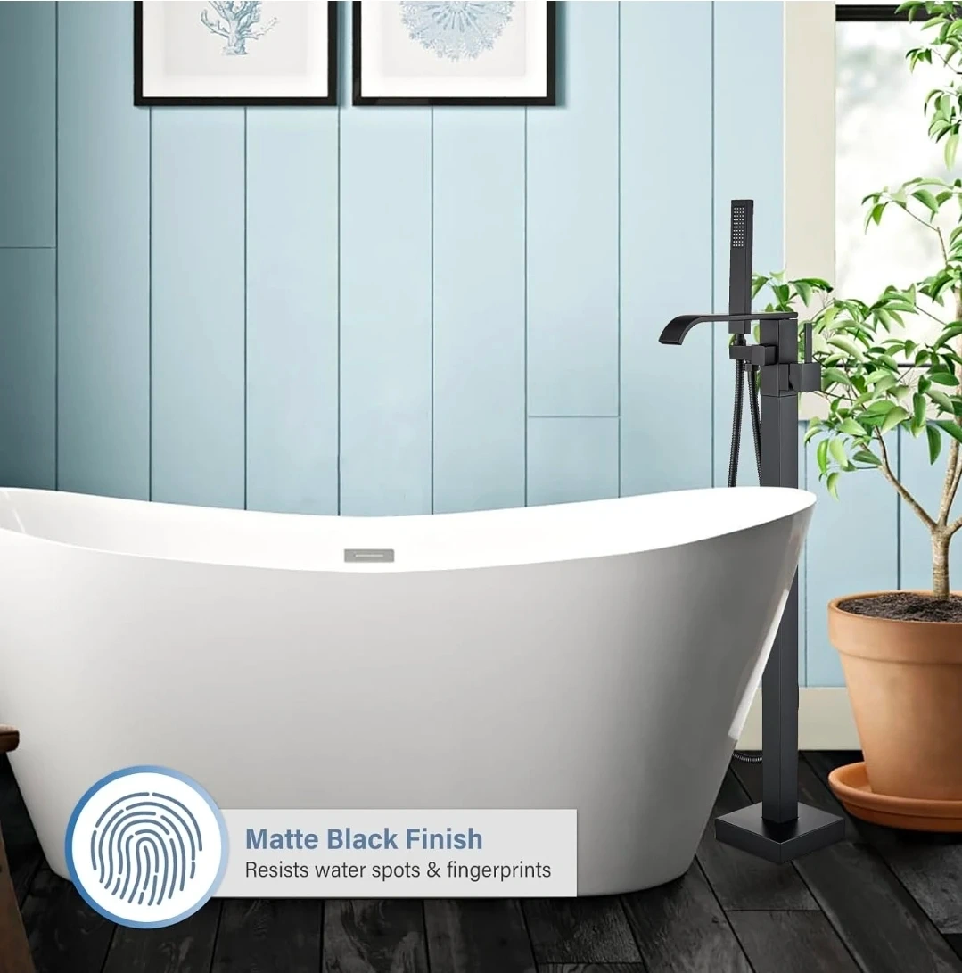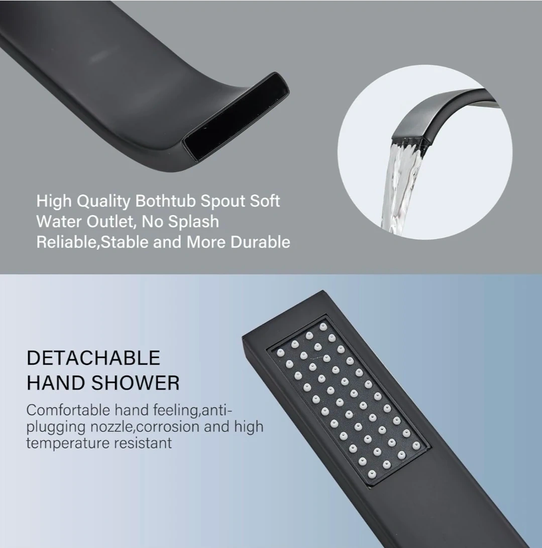 This freestanding bathtub faucet features a matte black finish and a high-flow aerated spout. It includes a handheld shower with a 59-inch stainless steel hose. The faucet body is solid brass with a sturdy ceramic valve.