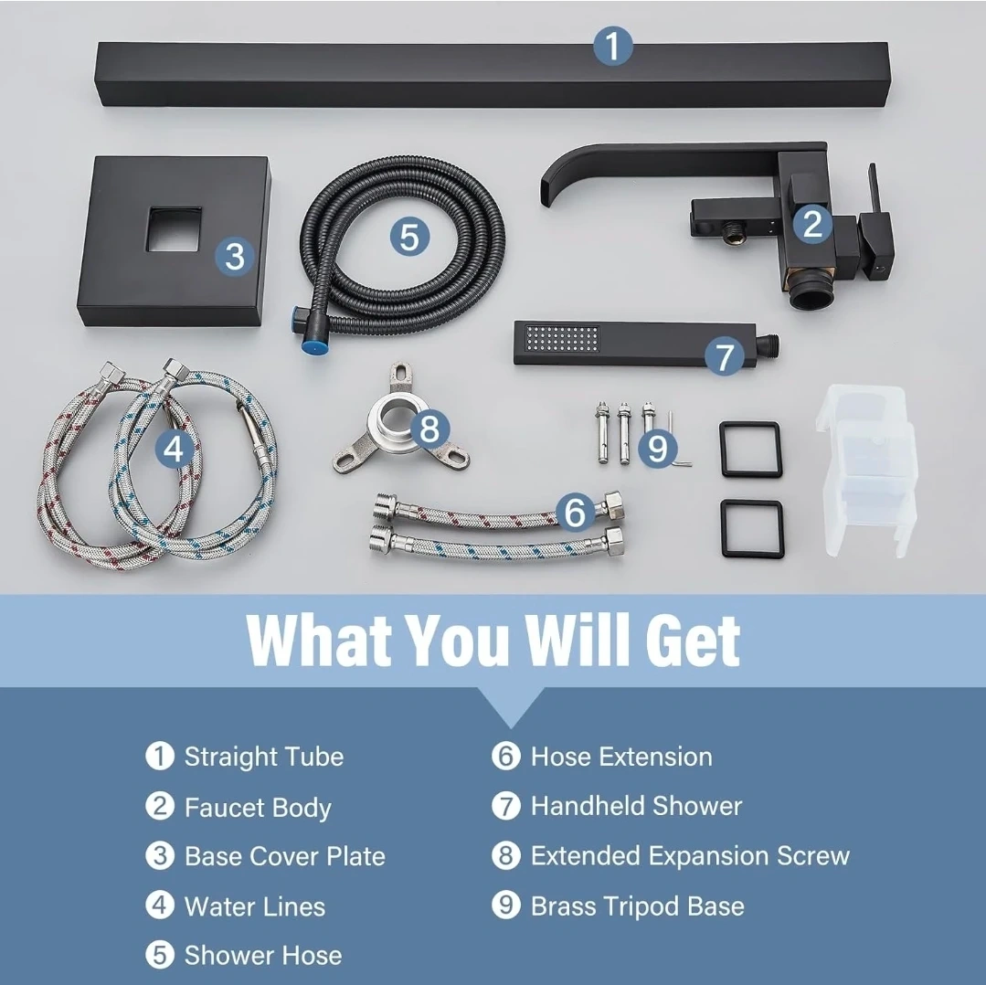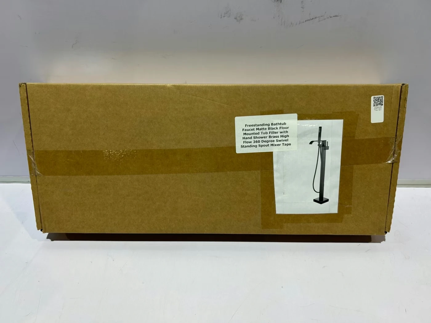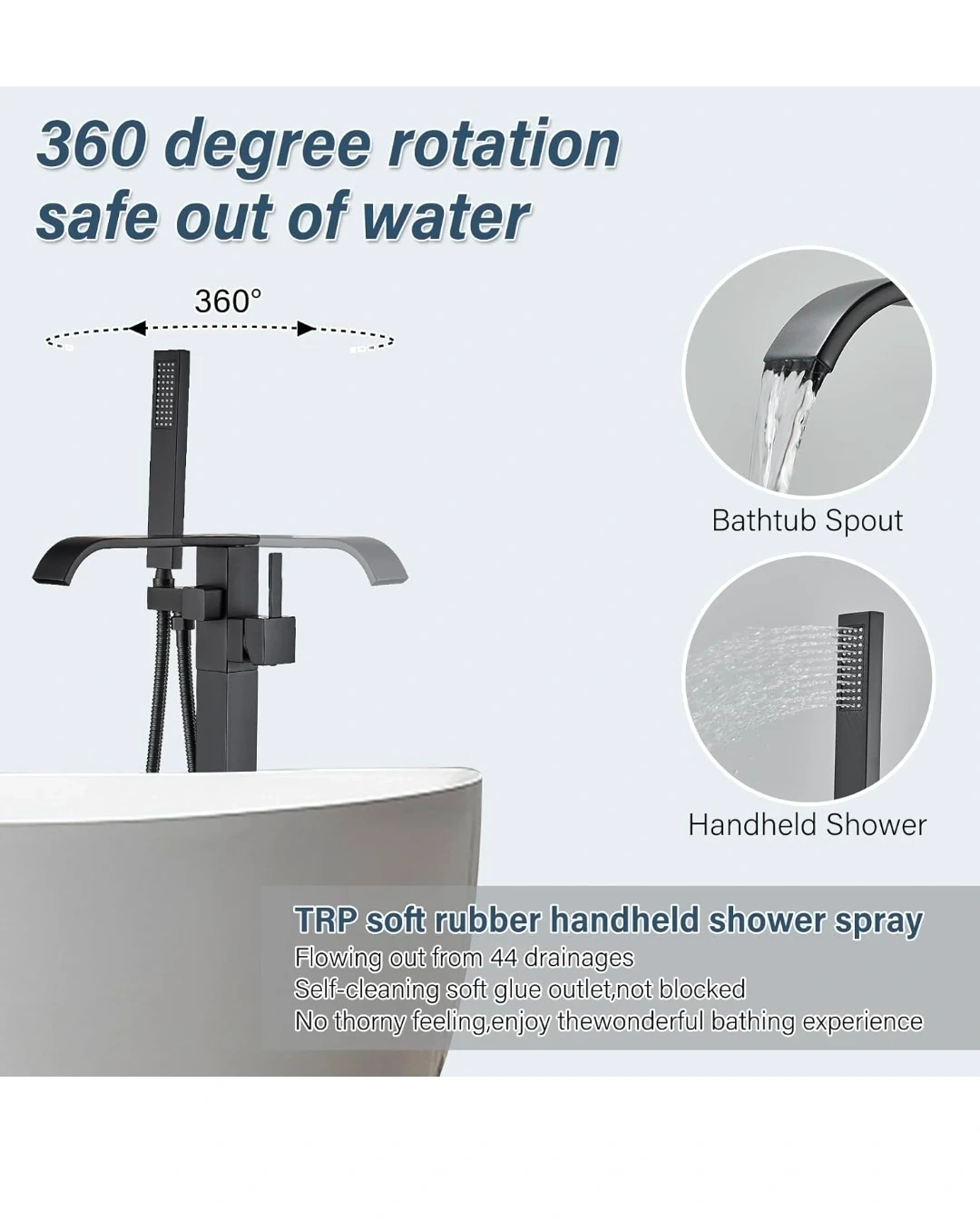 This freestanding bathtub faucet features a matte black finish and a high-flow aerated spout. It includes a handheld shower with a 59-inch stainless steel hose. The faucet body is solid brass with a sturdy ceramic valve.