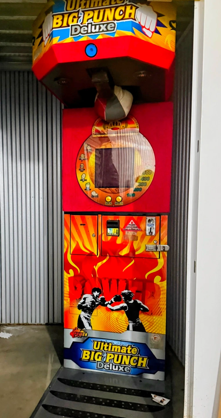 This is the Ultimate Big Punch Deluxe arcade boxing game. It's a full-size machine ready for your home or business! The display shows scoring and punch count. It's got exciting graphics and sounds to keep players engaged.