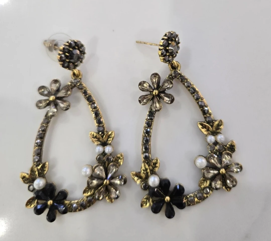 These are a pair of lovely dangle earrings with a floral design. They feature a mix of black and gold tones, giving them a stylish look. Perfect for adding a touch of elegance to any outfit!