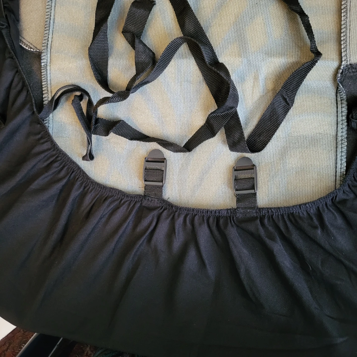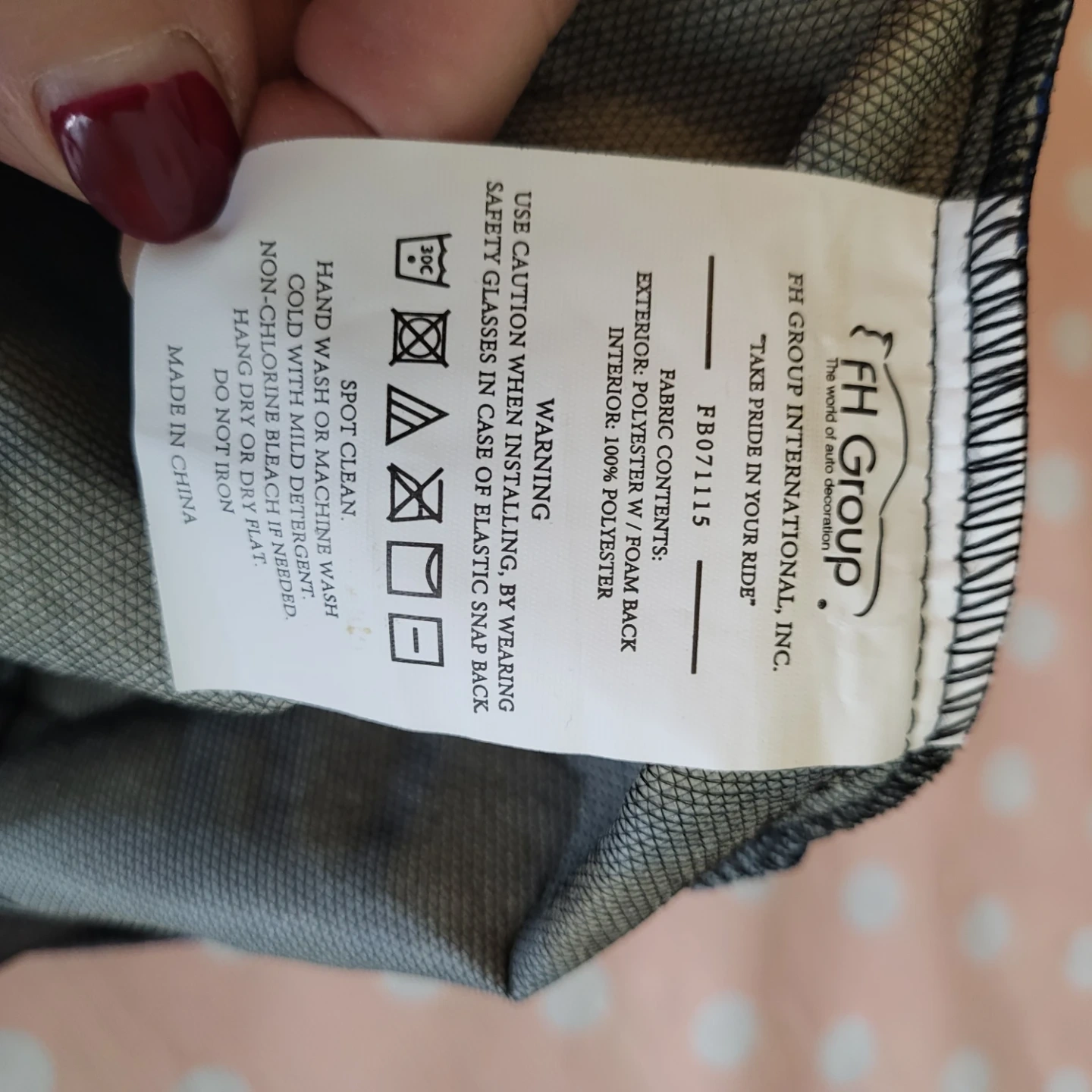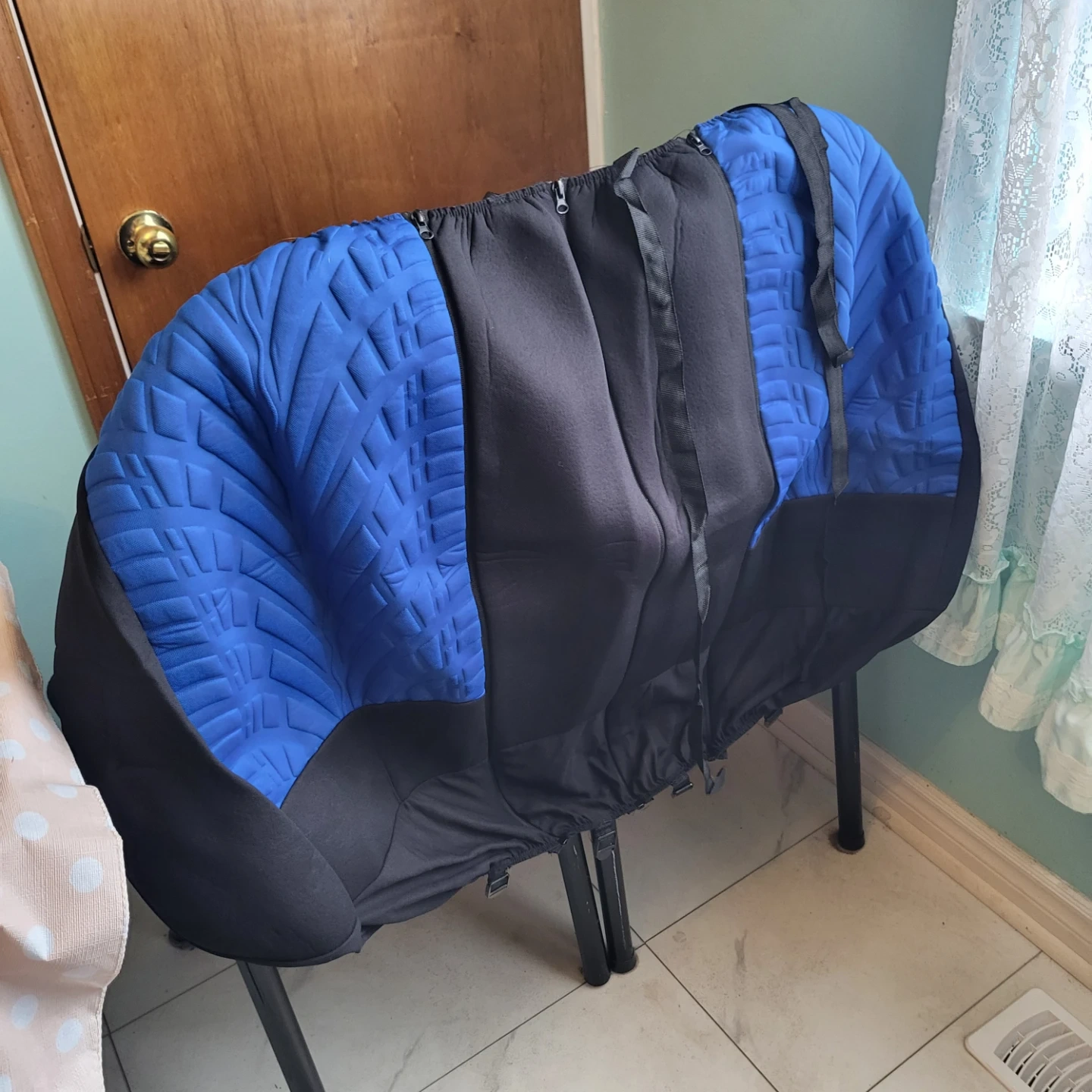 Selling a SUV Van seat covers in blue and black. It looks like it's in great shape and ready to protect your car seats! It features a tire tread pattern in the blue sections. The back has adjustable straps for a snug fit