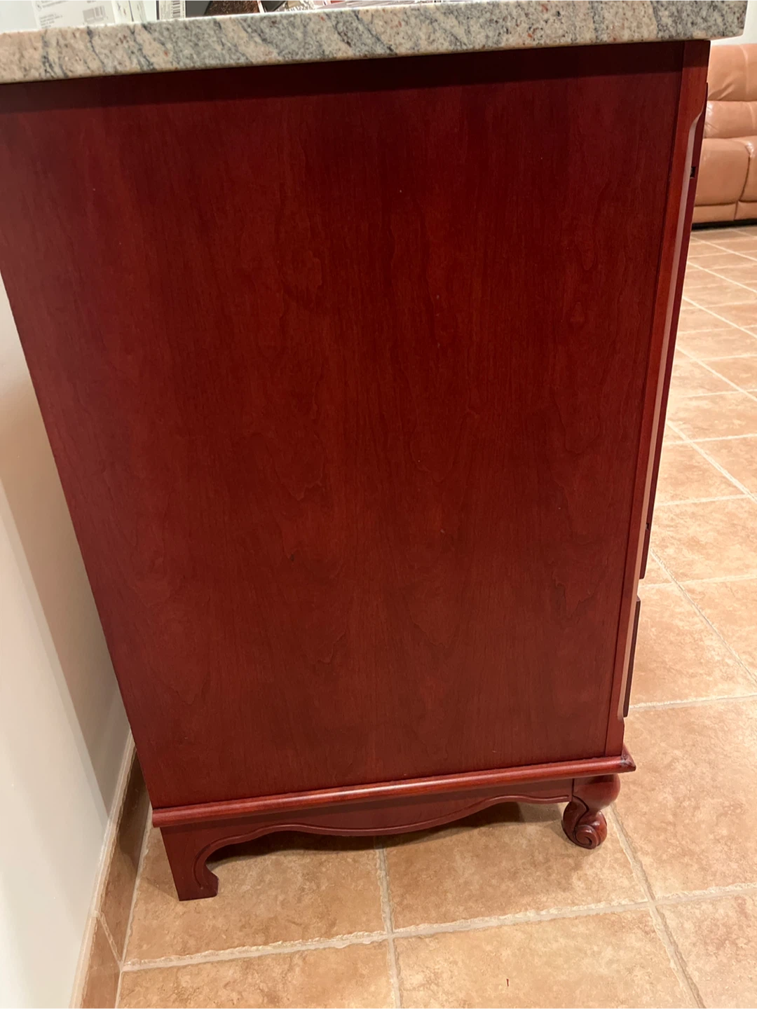 Here's a lovely wooden cabinet featuring a granite top! It has a rich, dark wood finish and a beautiful granite surface. Perfect for adding a touch of elegance to any room!