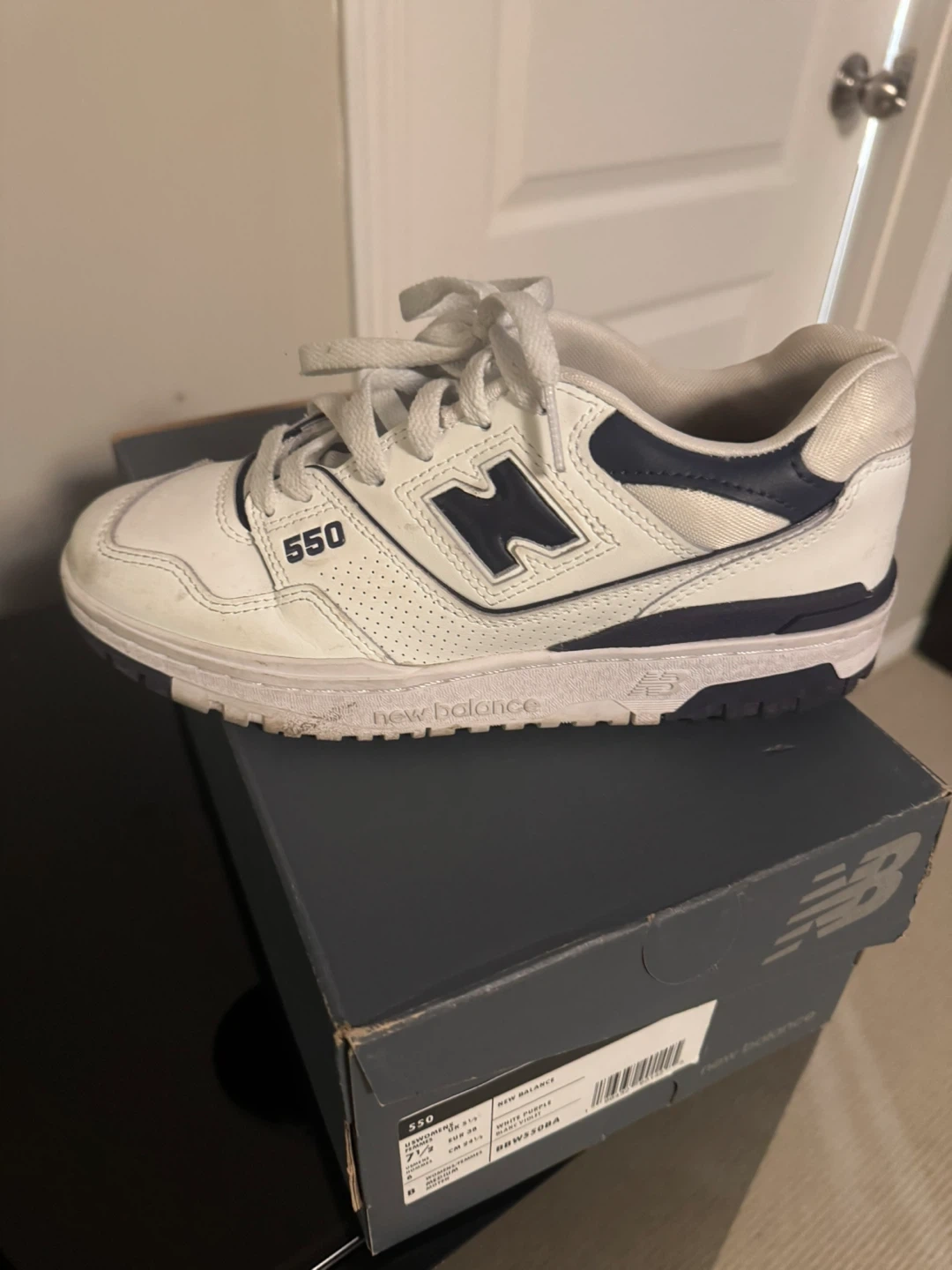 Selling a pair of New Balance 550 sneakers in white and purple, women's size 7.5. These are in great condition and come with the original box. The model number is BBW550BA. Perfect for adding a stylish touch to your everyday look!