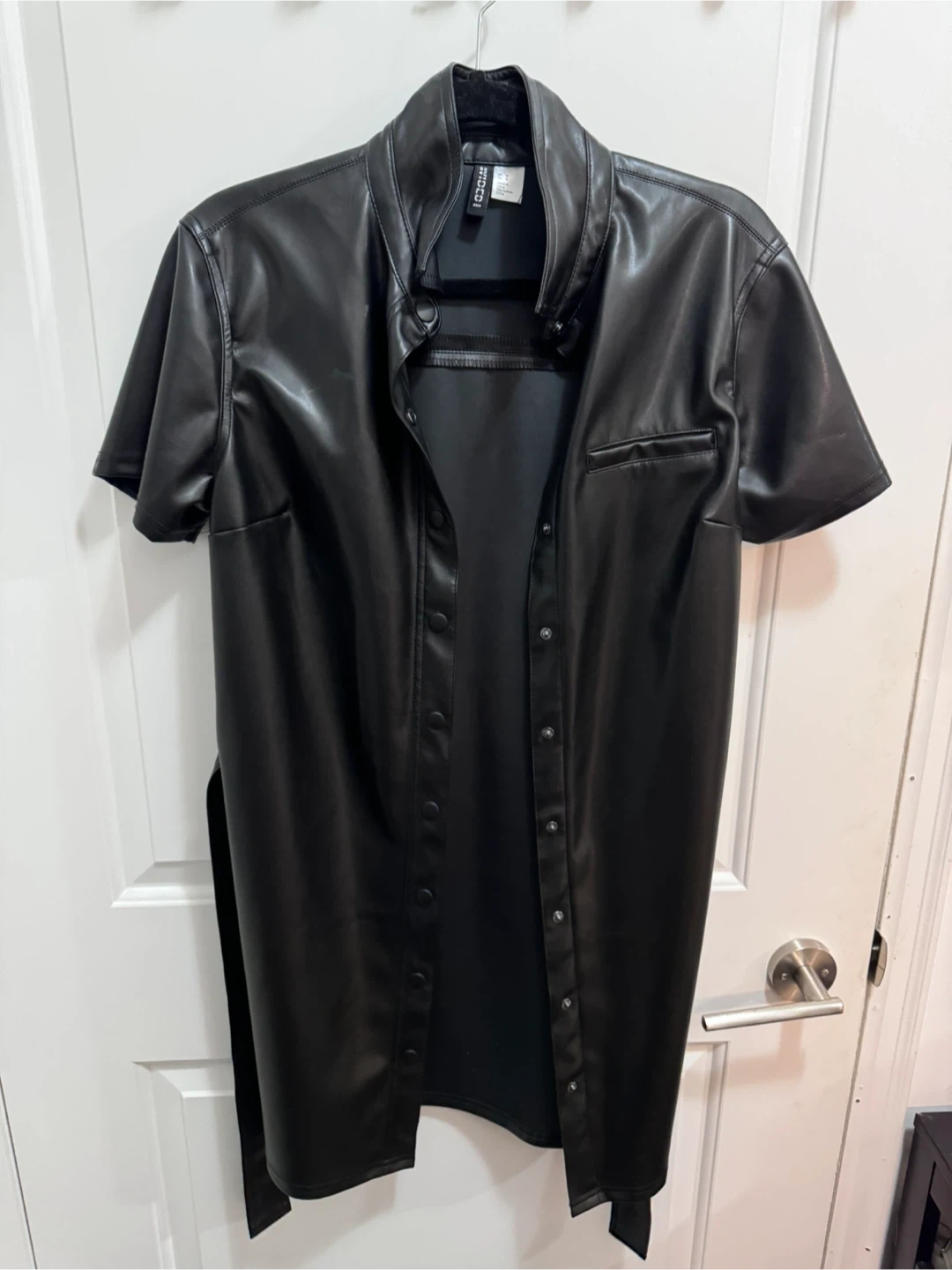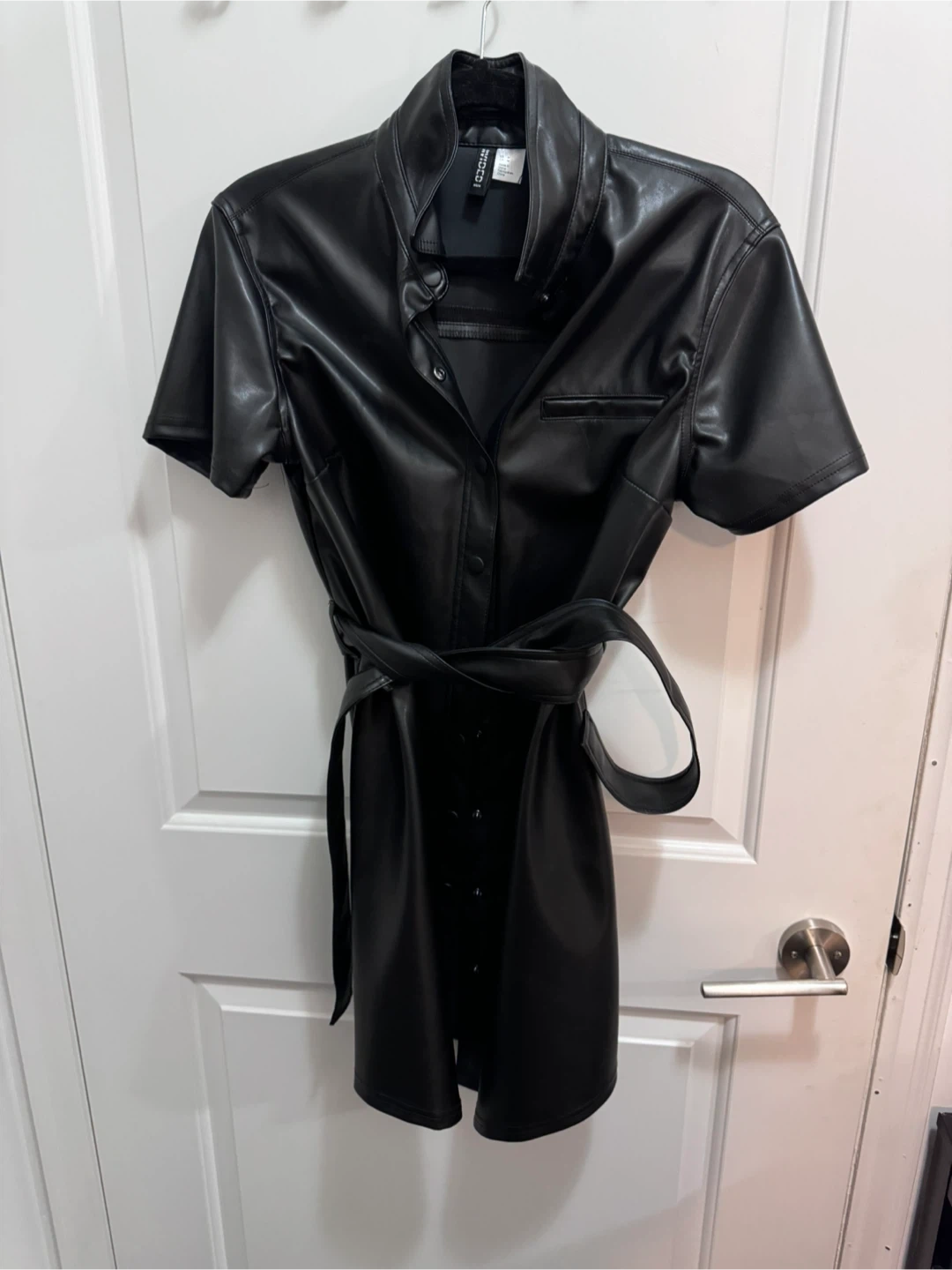 60This H&M faux leather shirt dress is a stylish addition to any wardrobe! It features a button-down front and a tie waist for a flattering fit. The dress is in great condition and ready for a new home. The colour is black and the material is faux leather.