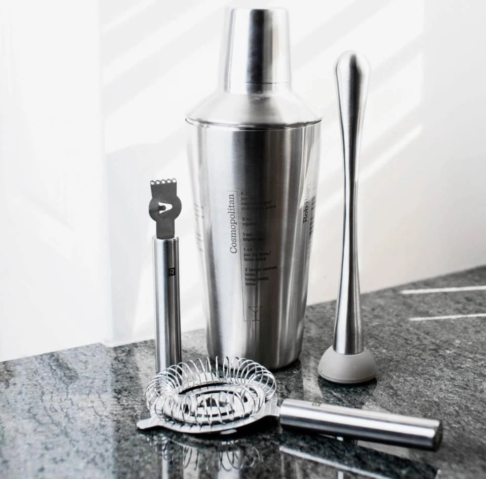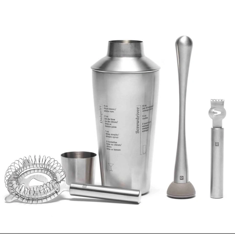 Set includes: Measuring cup, Citrus zester, Muddler, Strainer and Shaker. Cocktail guide included with helpful tips & Ricardo's favourite cocktail recipes. Great for bar set setup.