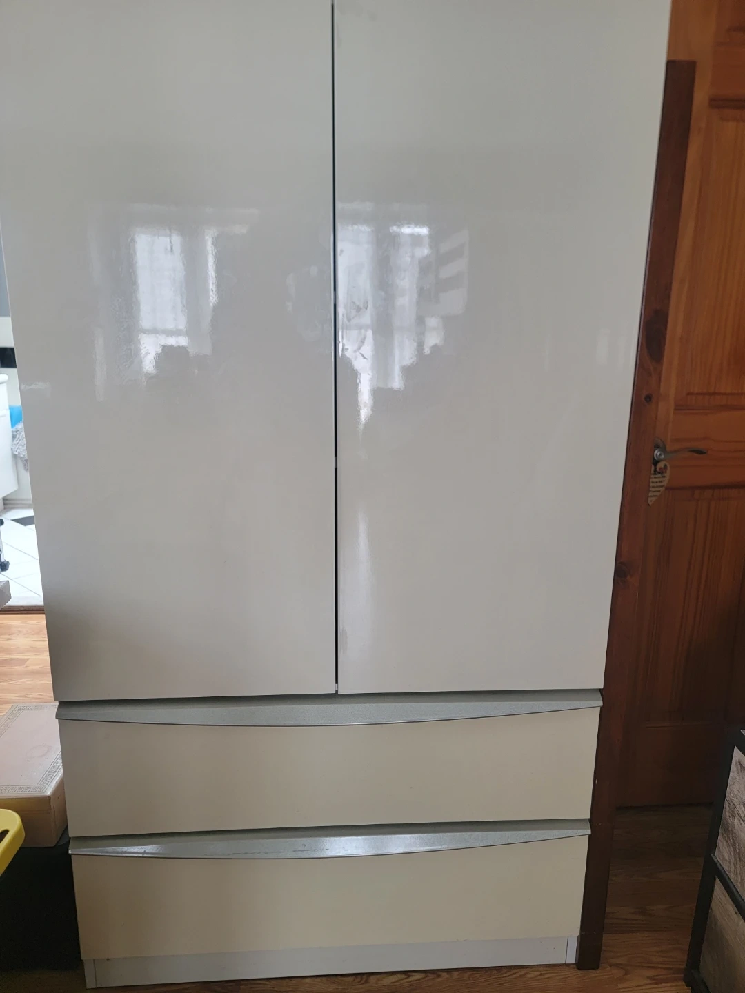 Selling a wardrobe with two doors and drawers at the bottom. It has a neutral color that would fit in with any decor