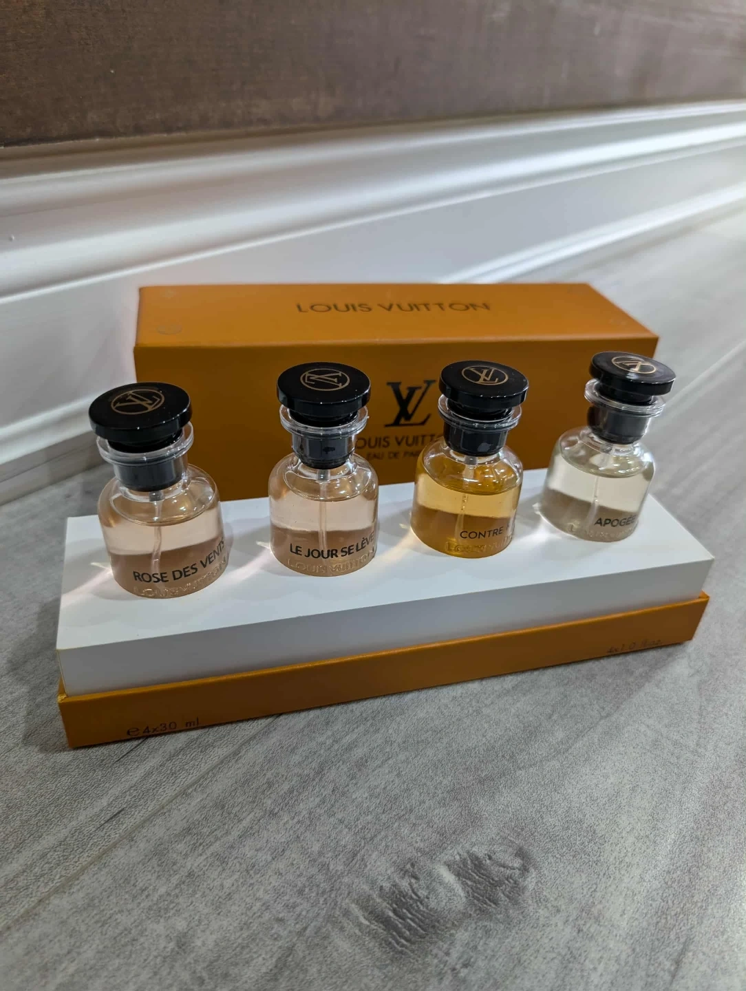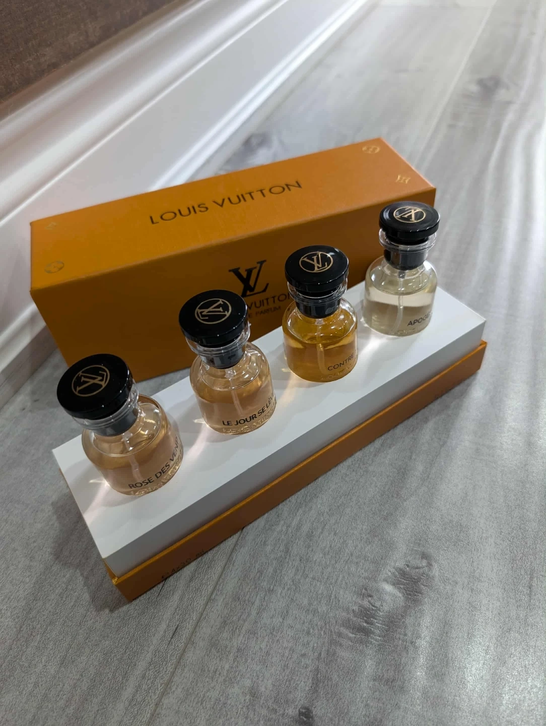 Selling a Louis Vuitton miniature perfume set! It comes with four different scents, each in 30ml bottles. The set includes Rose Des Vents, Le Jour Se Lève, Contre Moi, and Apogée. Perfect for trying out different fragrances!