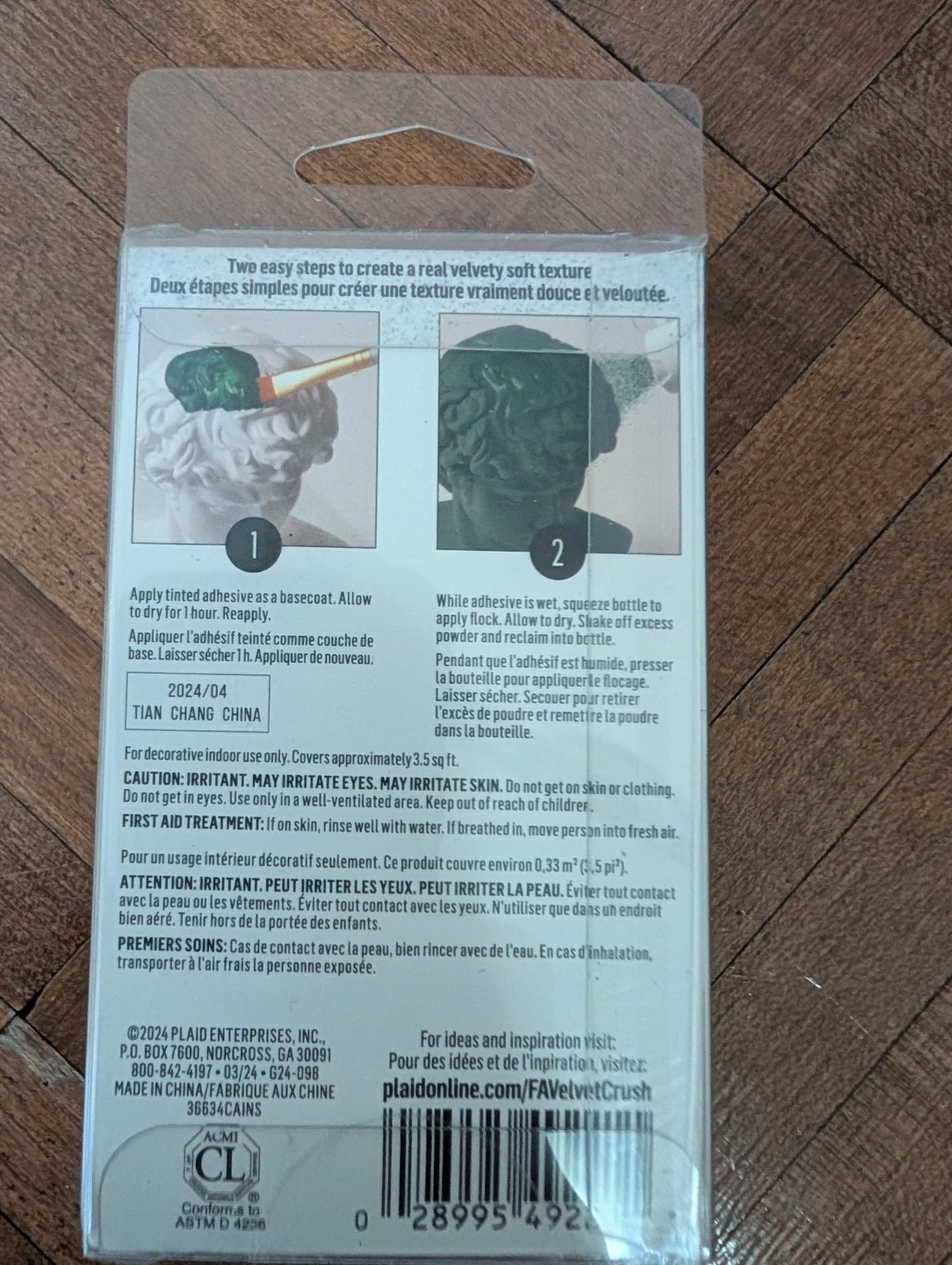 Get a real velvety soft texture with this Plaid FolkArt Velvet Crush Flocking Kit! Includes everything you need for a two-step flocking process. Perfect for adding a unique touch to your crafts and decor. Manufacturing Date: 2024 April 04