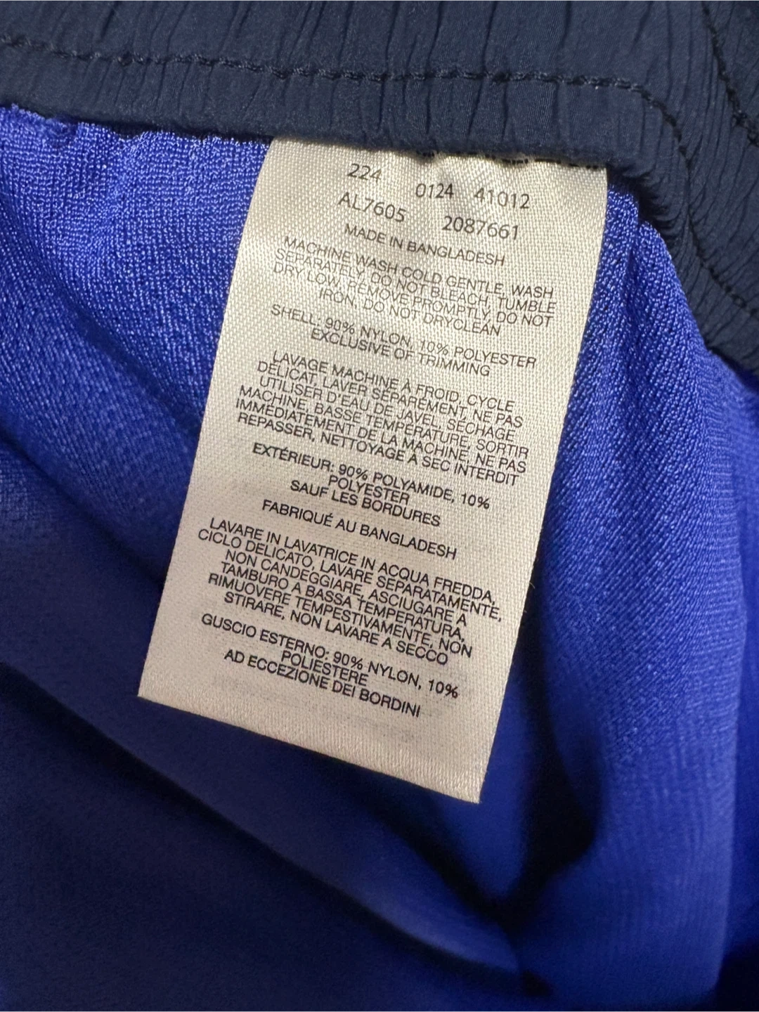 247Columbia lines pants, wind proof and rain resistant. Worn only once as they were too large for me. I pad $125 for them, size XL and made of 90% nylon and 10% polyester. The colour is a vibrant purple/blue. From smoke free pet free home