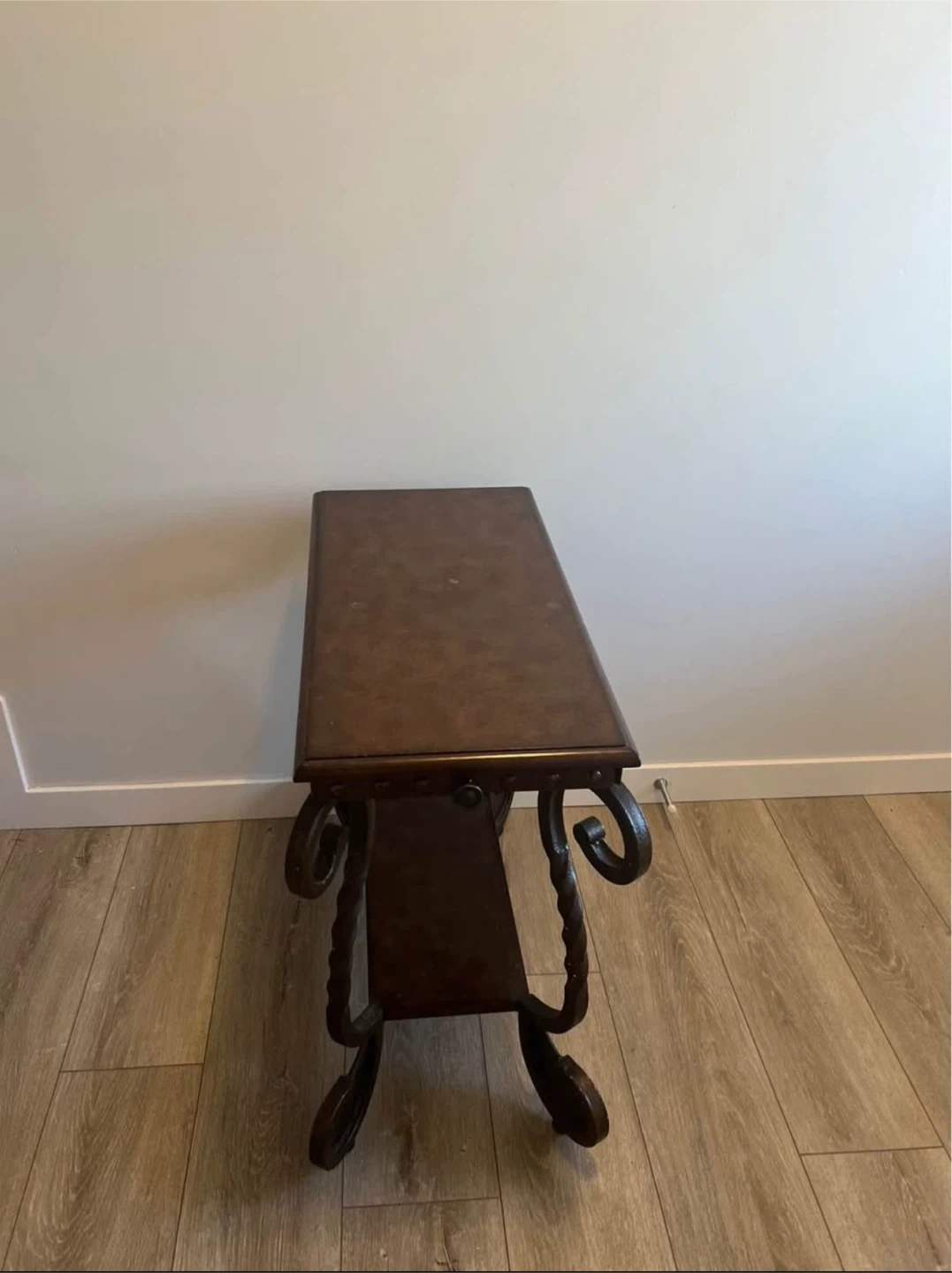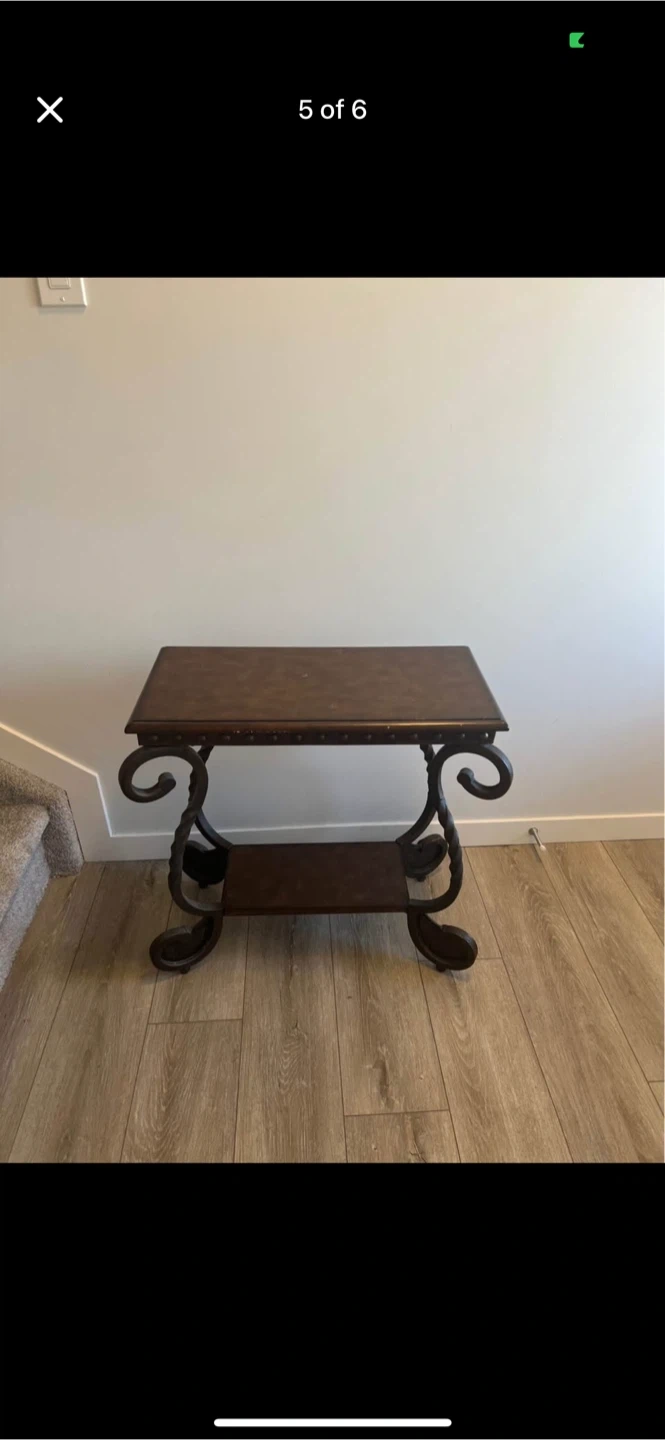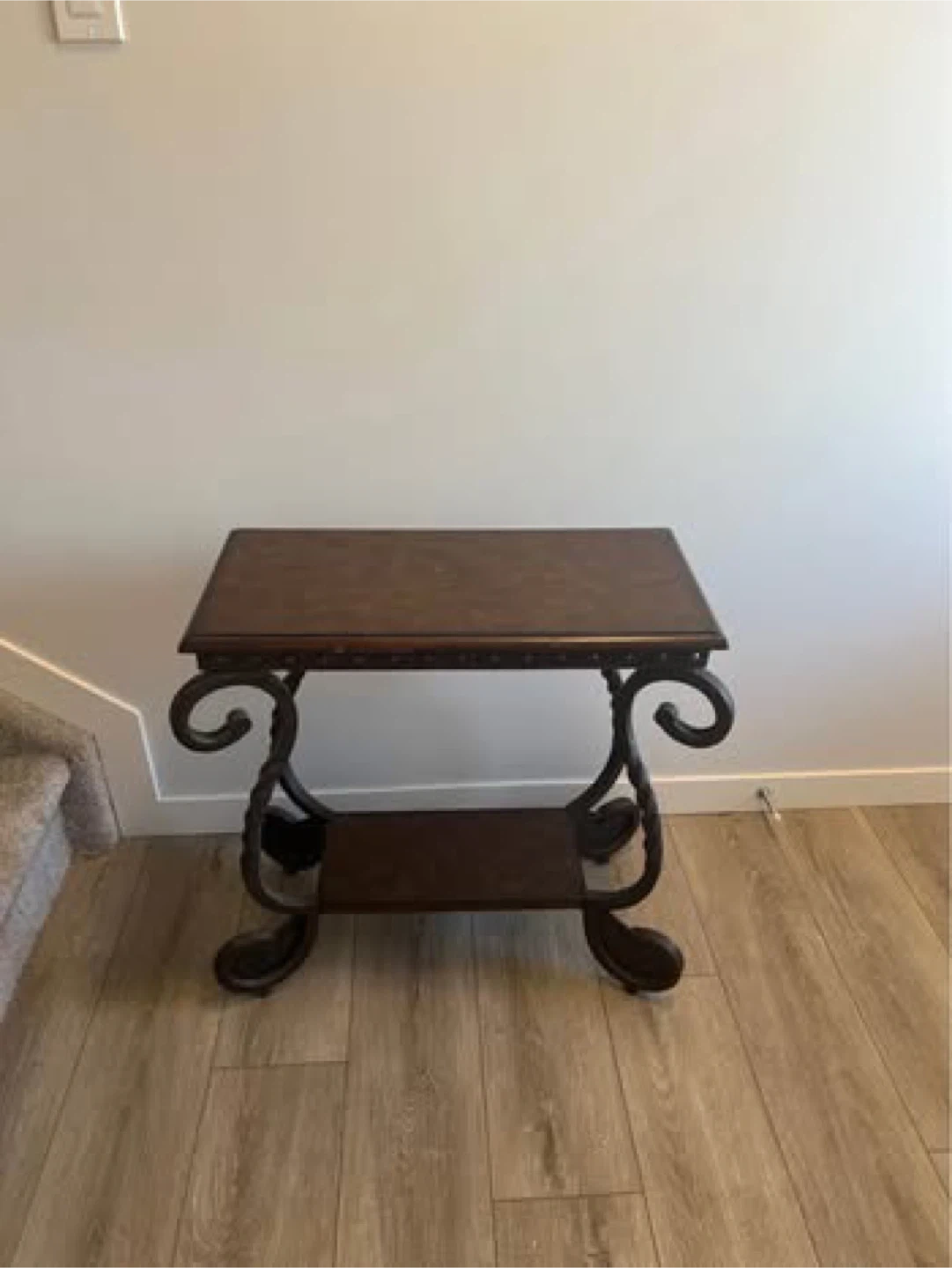 Ashley Rafferty Chairside End Table T382-7 .It has a unique design with decorative metal accents and a lower shelf for storage or display. It's in good condition and would be a nice addition to any room. Original price from retailer $474.