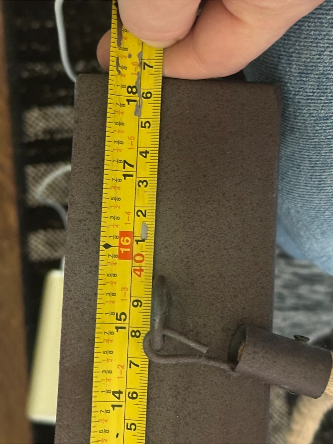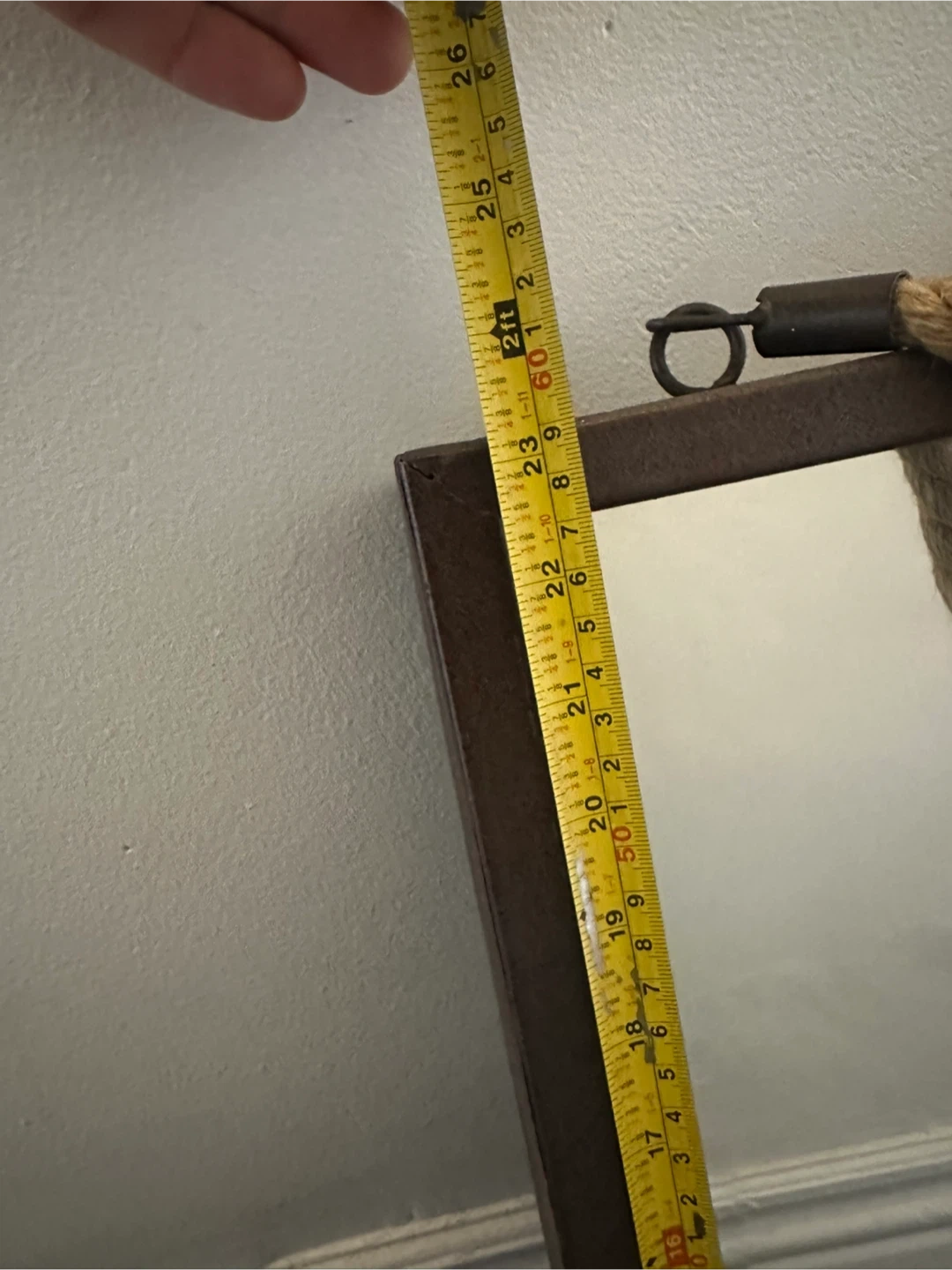18 1/4” x 23 1/4”. Mirror with a rustic brown metal frame and a charming rope hanger.