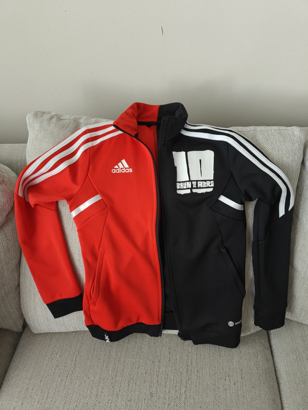 Adidas track jacket in red and black. It's in great condition and perfect for active kids. Size is 9-10Y, which is equivalent to a size 140. The jacket features the Adidas logo and AEROREADY technology for moisture management