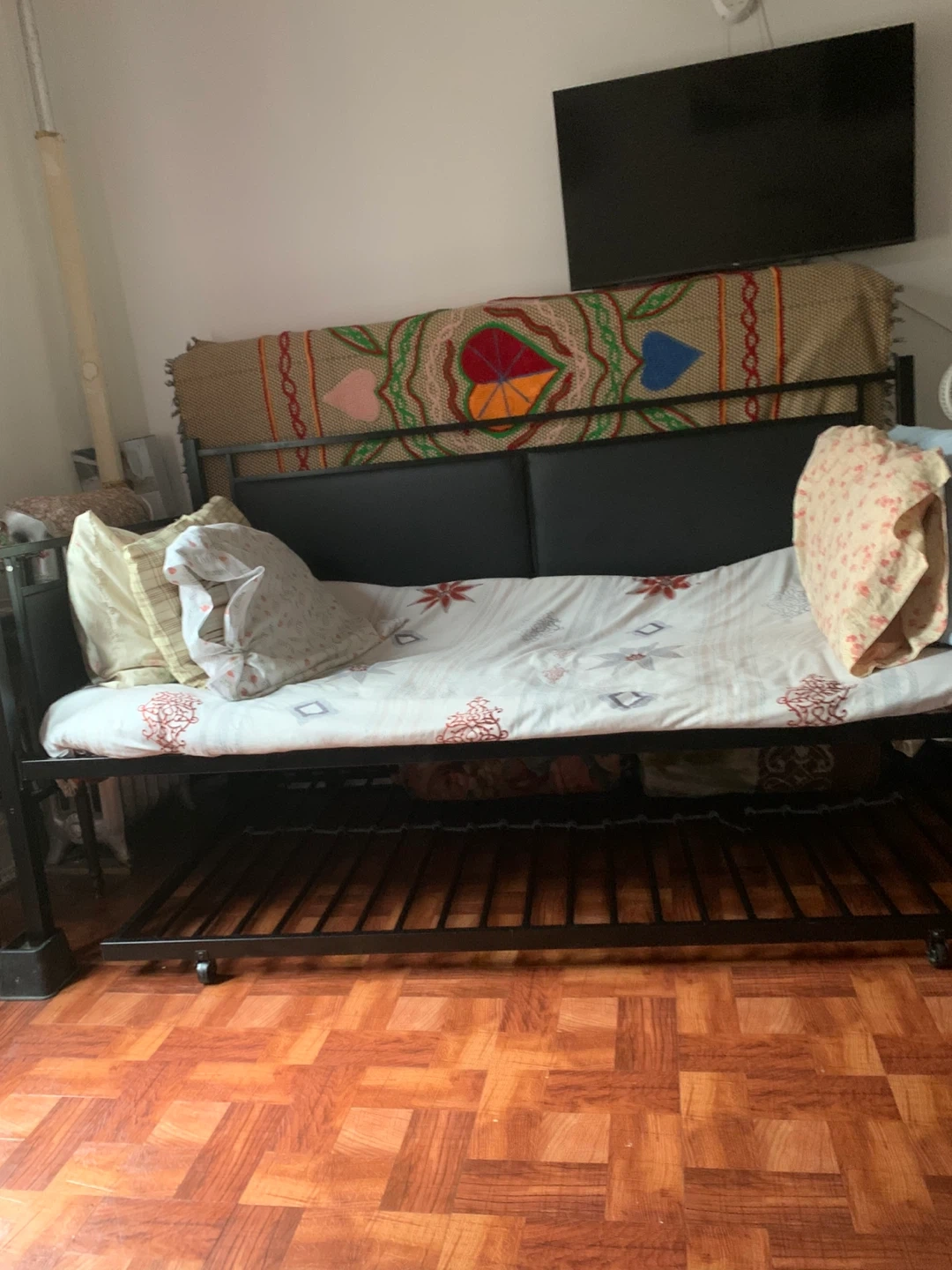 Selling a black daybed frame in good condition. It's a versatile piece of furniture that can be used as a sofa during the day and a bed at night. Perfect for a guest room or small apartment