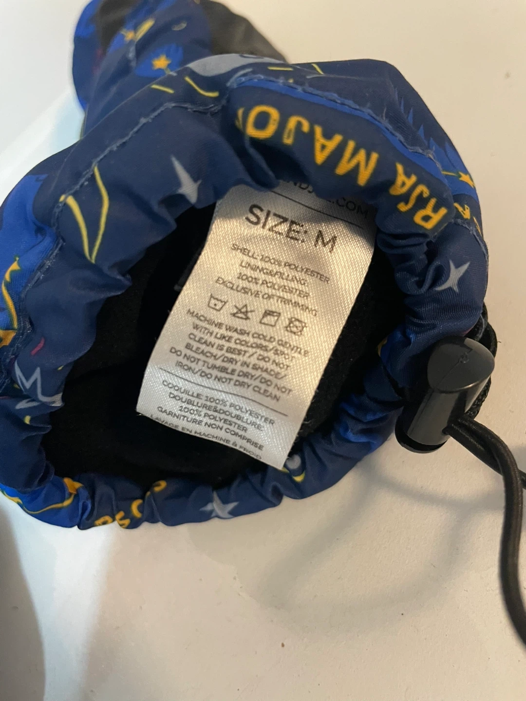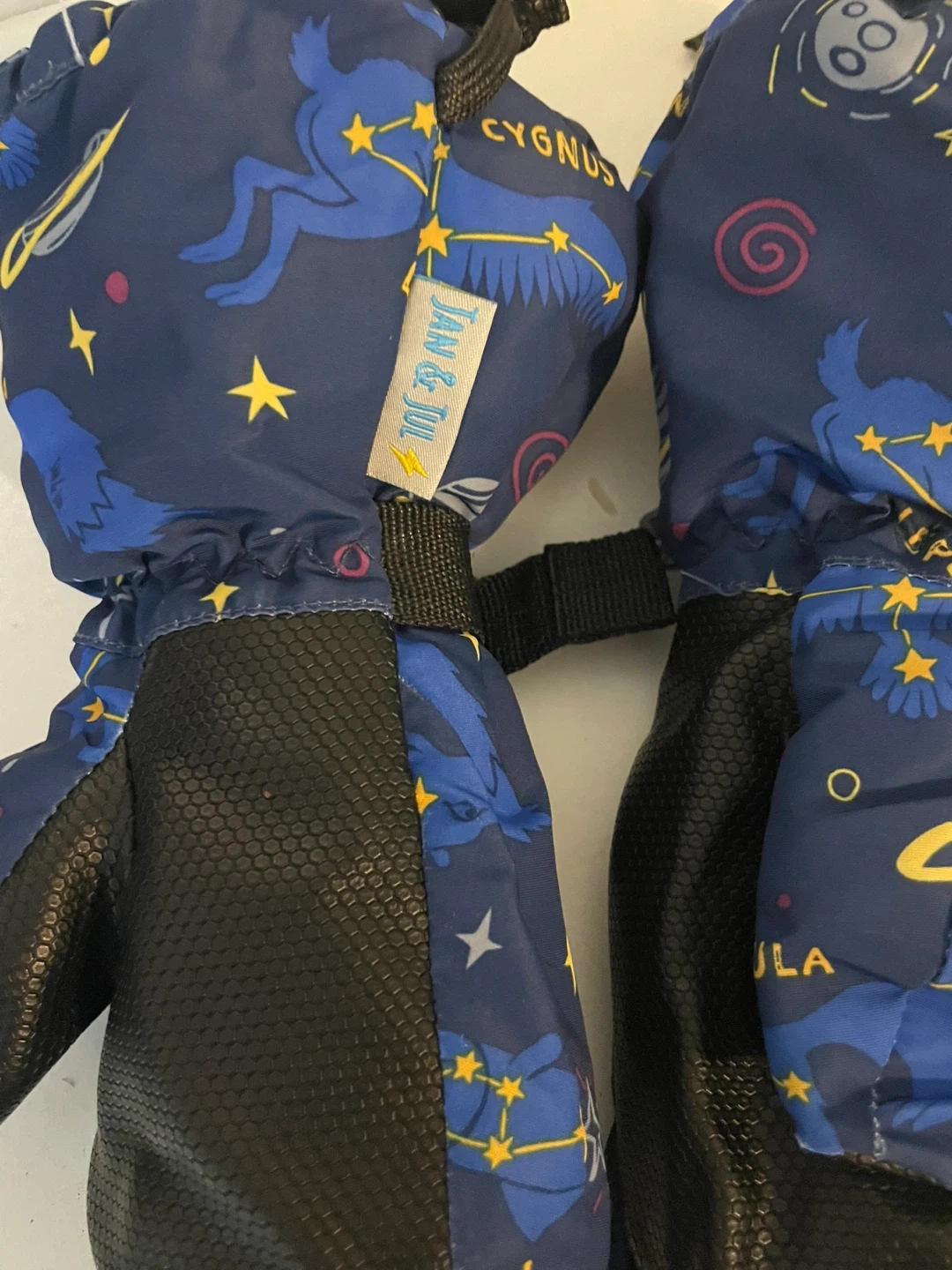 Keep your little one warm with these Jan & Jul mittens! They're size M and feature a fun constellation pattern in blue and yellow. Made with 100% polyester shell, lining, and filling. Machine washable for easy care. Like new condition, my son grew out of it too fast.