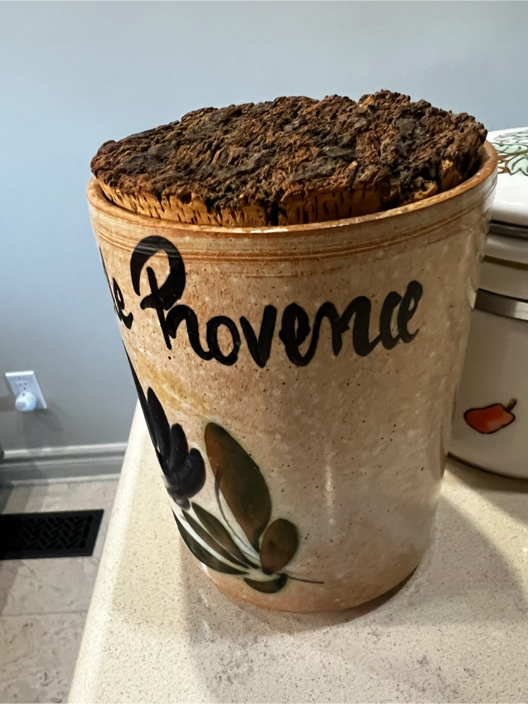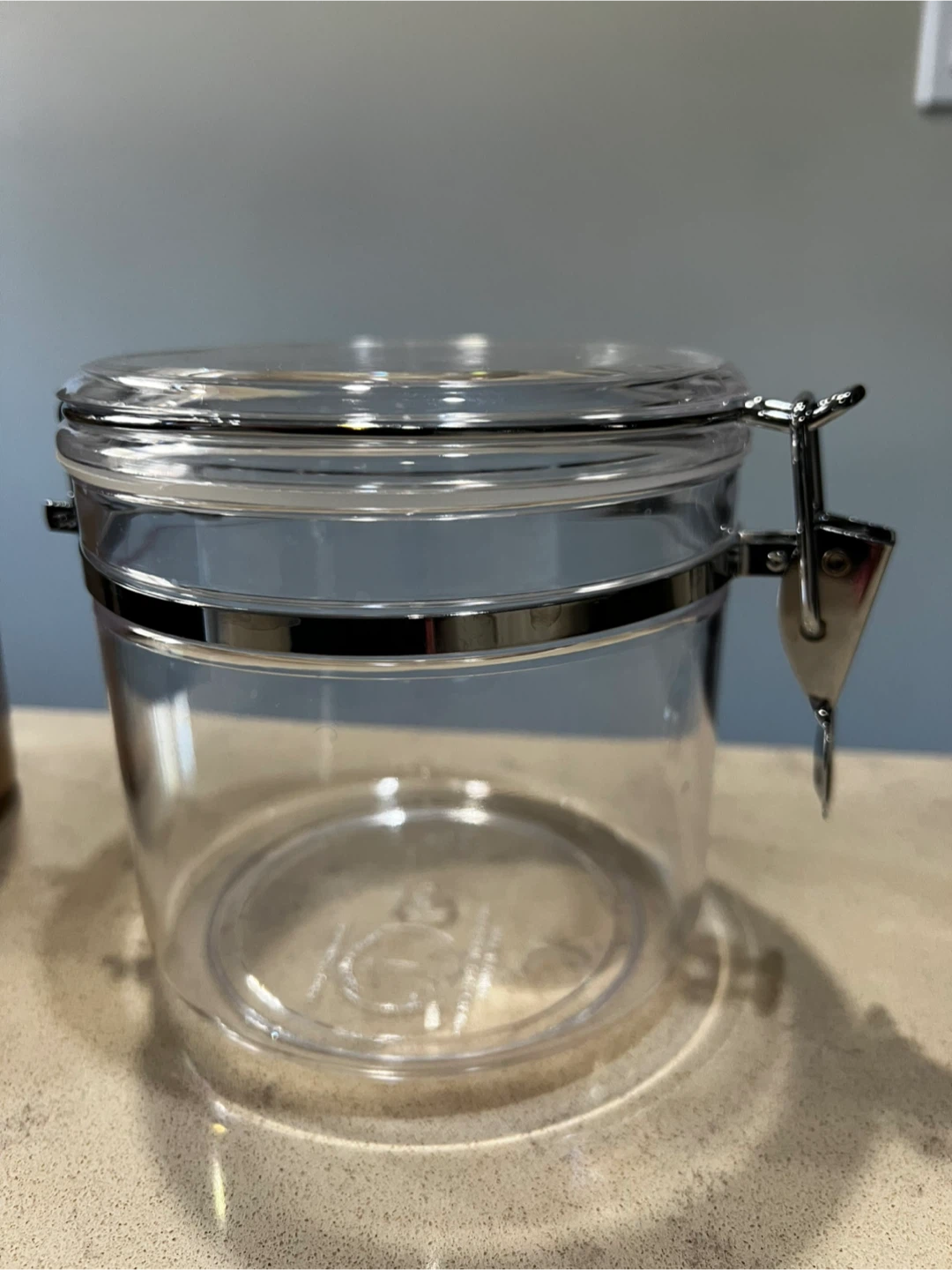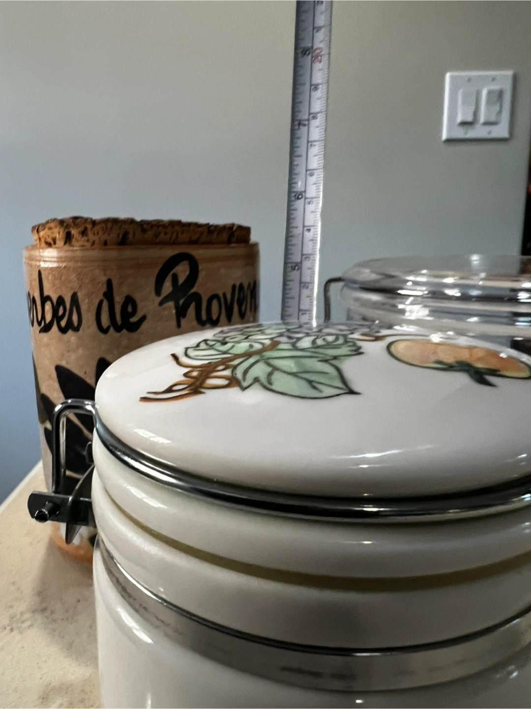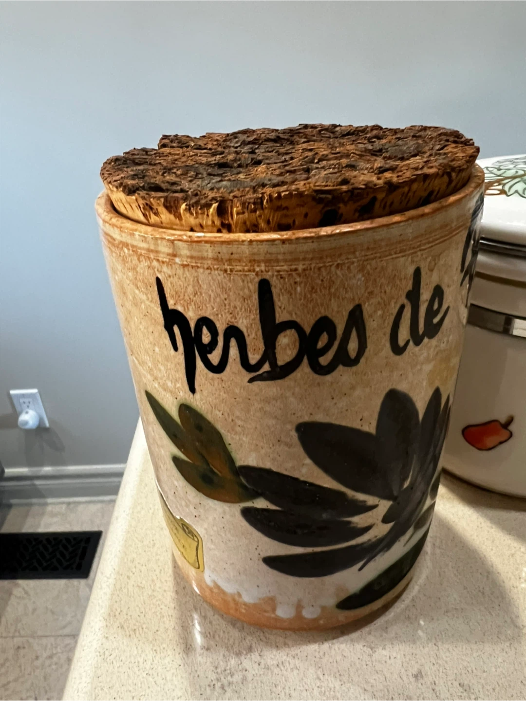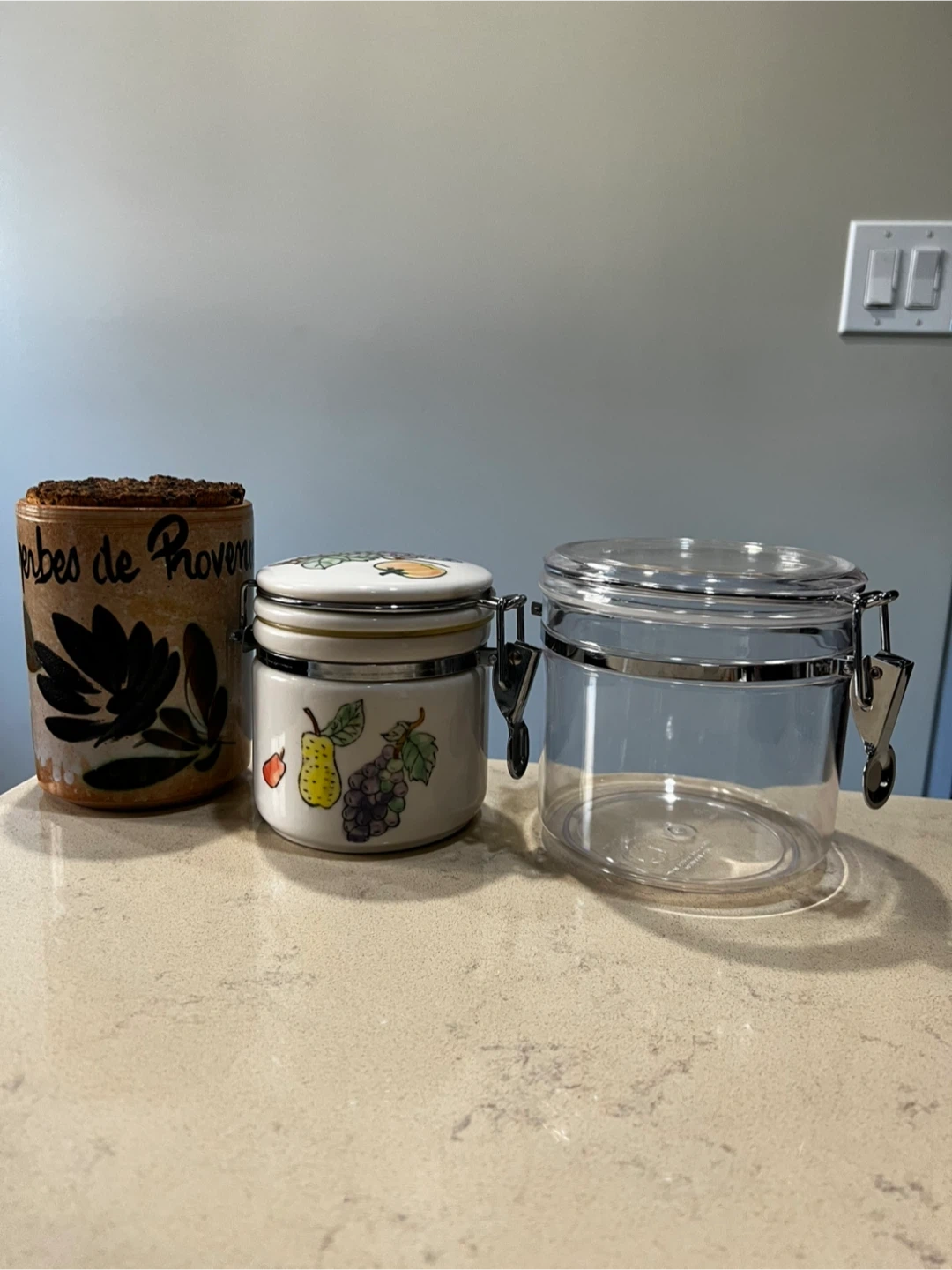 Selling a 3 canisters, ceramic kitchen canister with a "Herbes de Provence" design. One with fruit and a clear plastic one. It's a lovely way to add some rustic charm to your kitchen storage.