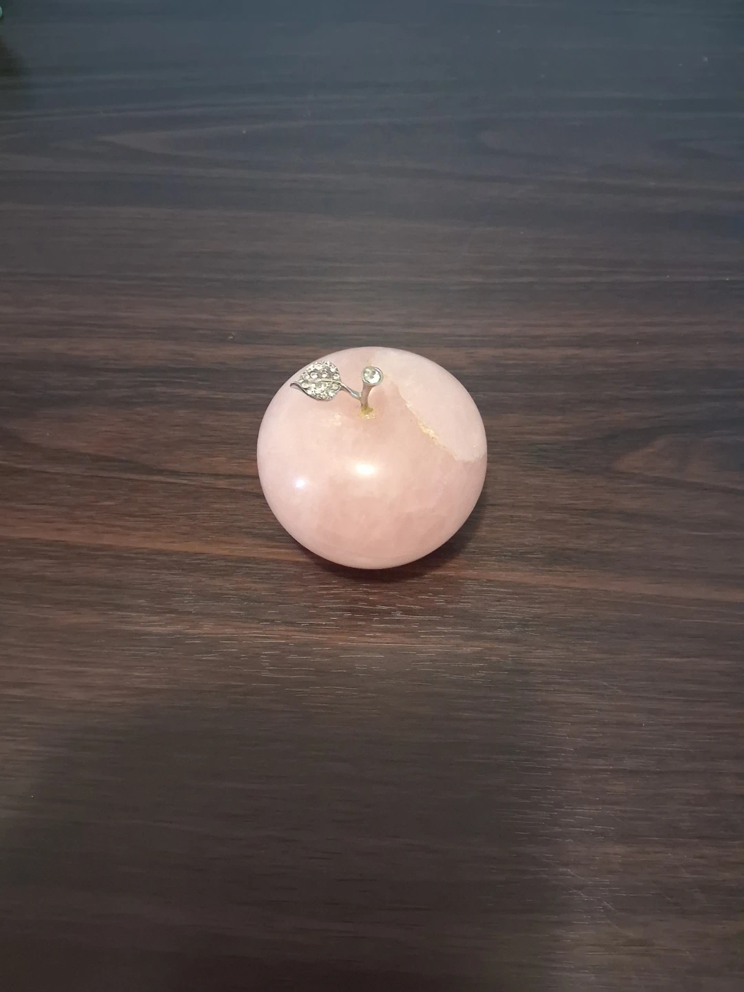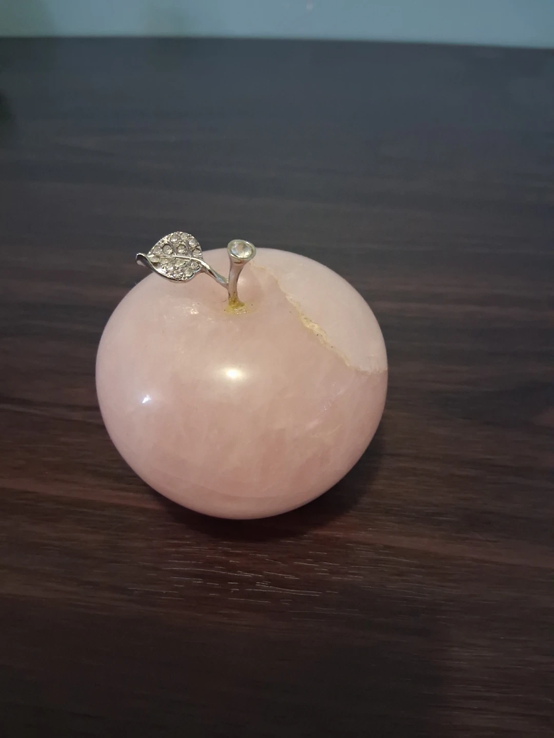 549Selling a lovely rose quartz apple with a rhinestone leaf accent. It's a beautiful decorative piece for your home or office! The stone is a soft pink colour and has a smooth, polished finish. It's a bigger piece and kinda heavy, takes up alot of my hand.