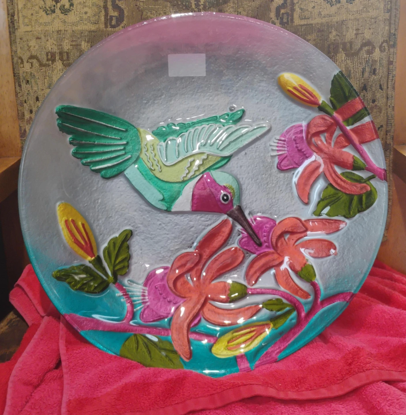 Beautiful decorative glass plate featuring a hummingbird and flower design. It's in great condition and would make a lovely addition to any home