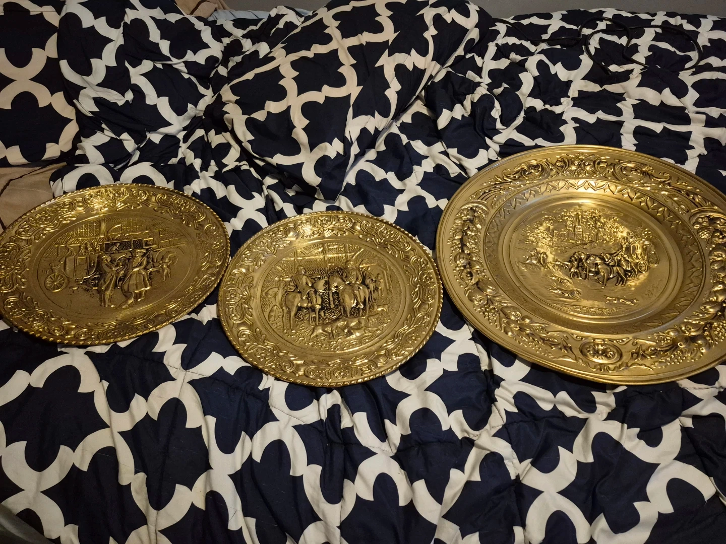 Selling a set of three vintage decorative brass plates. They feature intricate designs and would make a lovely addition to any home decor. They are in good condition.