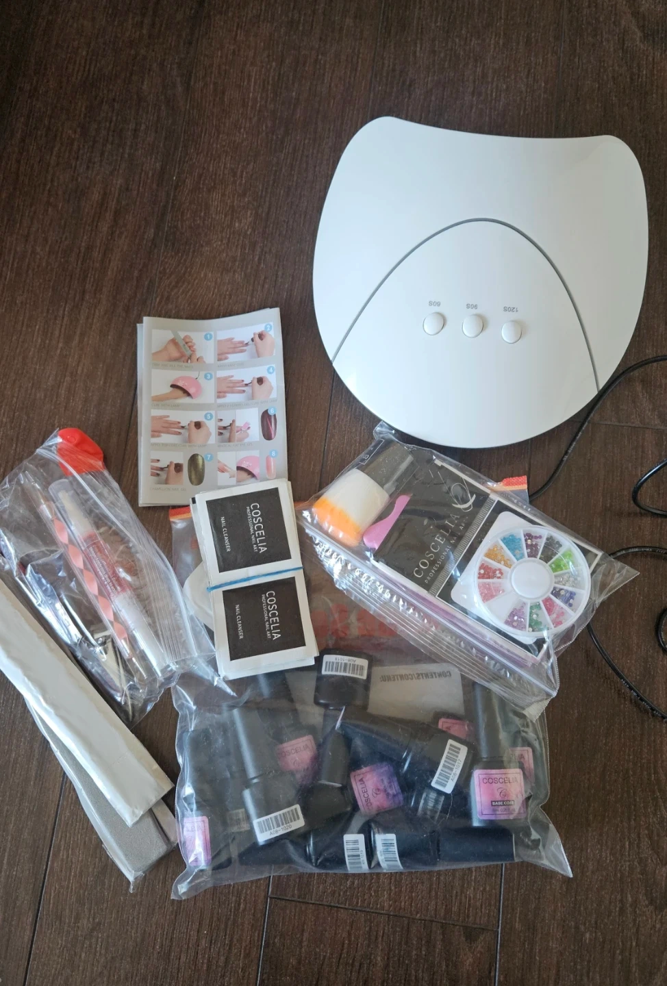 Selling a Coscelia nail art set, complete with a UV lamp for curing your gels! It includes nail cleansers, various nail polishes, and decorative rhinestones to make your nails shine. Also comes with a nail file and cuticle pusher to get your nails looking their best. Used only once.